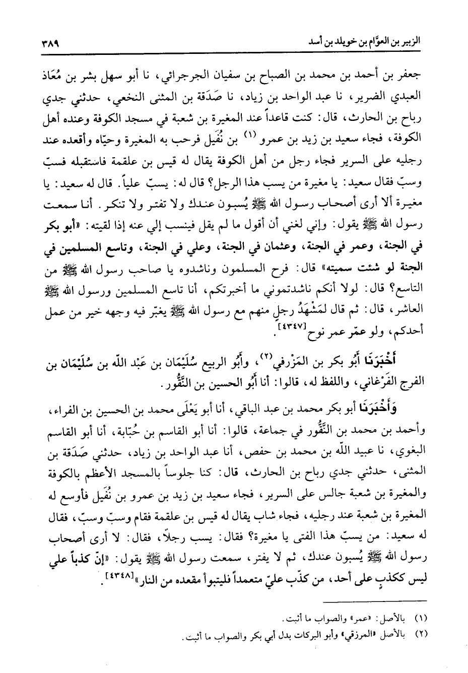 جعفر بن أحمد بن محمد بن الصباح بن سفيان الجرجرائي نا أبو سهل بشر بن معاذ العبدي الضرير نا عبد الواحد بن زياد نا صدقة بن المثنى النخعي حدثني جدي رباح بن الحارث قال كنت قاعدا عند المغيرة بن شعبة في مسجد الكوفة وعنده أهل الكوفة فجاء سعيد بن زيد بن عمرو (1) بن نفيل فرحب به المغيرة وحياه وأقعده عند رجليه على السرير فجاء رجل من أهل الكوفة يقال له قيس بن علقمة فاستقبله فسب وسب فقال سعيد يا مغيرة من يسب هذا الرجل قال له يسب عليا قال له سعيد يا مغيرة ألا أرى أصحاب رسول الله (صلى الله عليه وسلم) يسبون عندك ولا تفتر ولا تنكر أنا سمعت رسول الله (صلى الله عليه وسلم) يقول وإني لغني أن أقول ما لم يقل فينسب إلي عنه إذا لقيته أبو بكر في الجنة وعمر في الجنة وعثمان في الجنة وعلي في الجنة وتاسع المسلمين في الجنة لو شئتت سميته قال فرح المسلمون وناشدوه يا صاحب رسول الله (صلى الله عليه وسلم) من التاسع قال لولا أنكم ناشدتموني ما أخبرتكم أنا تاسع المسلمين ورسول الله (صلى الله عليه وسلم) العاشر قال ثم قال لمشهد رجل منهم مع رسول الله ص يغبر فيه وجهه خير من عمل أحدكم ولو عمر عمر نوح أخبرنا أبو بكر بن المزرفي (2) وأبو الربيع سليمان بن عبد الله بن سليمان بن الفرج الفرغاني واللفظ له قالوا أنا أبو الحسين بن النقور وأخبرنا أبو بكر محمد بن عبد الباقي أنا أبو يعلى محمد بن الحسين بن الفراء وأحمد بن محمد بن النقور في جماعة قالوا أنا أبو القاسم بن حبابة أنا أبو القاسم البغوي نا عبيد الله بن محمد بن حفص أنا عبد الواحد بن زياد حدثني صدقة بن المثنى حدثني جدي رباح بن الحارث قال كنا جلوسا بالمسجد الأعظم بالكوفة والمغيرة بن شعبة جالس على السرير فجاء سعيد بن زيد بن عمرو بن نفيل فأوسع له المغيرة بن شعبة عند رجليه فجاء شاب يقال له قيس بن علقمة فقام وسب وسب فقال له سعيد من يسب هذا الفتى يا مغيرة فقال يسب رجلا فقال لا أرى أصحاب رسول الله (صلى الله عليه وسلم) يسبون عندك ثم لا يفتر سمعت رسول الله (صلى الله عليه وسلم) يقول إن كذبا علي ليس ككذب على أحد من كذب علي متعمدا فيتبوأ مقعده من النار