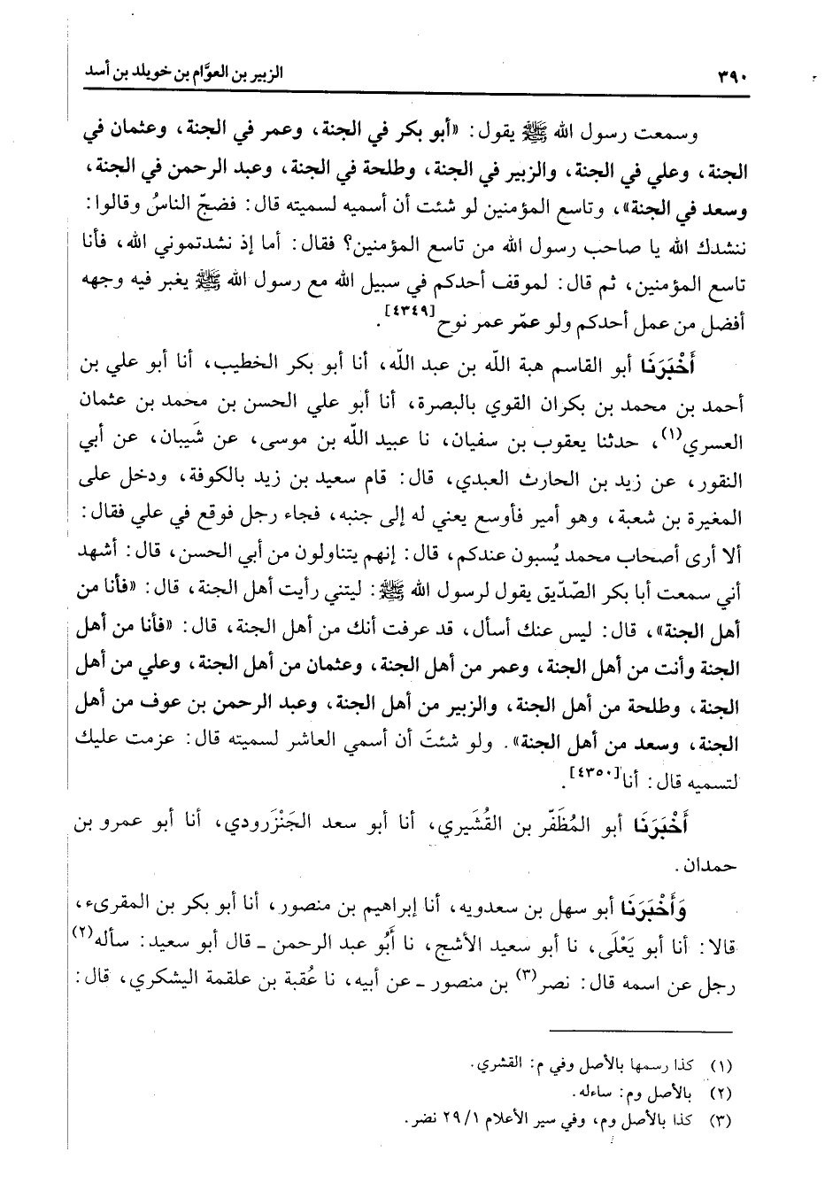 وسمعت رسول الله (صلى الله عليه وسلم) يقول أبو بكر في الجنة وعمر في الجنة وعثمان في الجنة وعلي في الجنة والزبير في الجنة وطلحة في الجنة وعبد الرحمن في الجنة وسعد في الجنة وتاسع المؤمنين لو شئت أن أسميه لسميته قال فضج الناس وقالوا ننشدك الله يا صاحب رسول الله من تاسع المؤمنين فقال أما إذ نشدتموني الله فأنا تاسع المؤمنين ثم قال لموقف أحدكم في سبيل الله مع رسول الله (صلى الله عليه وسلم) يغبر فيه وجهه أفضل من عمل احدكم ولو عمر عمر نوح أخبرنا أبو القاسم هبة الله بن عبد الله أنا أبو بكر الخطيب أنا أبو علي بن أحمد بن محمد بن بكران القوي بالبصرة أنا أبو علي الحسن بن محمد بن عثمان العسري (1) حدثنا يعقوب بن سفيان نا عبيد الله بن موسى عن شيبان عن أبي النقور عن زيد بن الحارث العبدي قال قام سعيد بن زيد بالكوفة ودخل على المغيرة بن شعبة وهو أمير فأوسع يعني له إلى جنبه فجاء رجل فوقع في علي فقال ألا أرى أصحاب محمد يسبون عندكم قال إنهم يتناولون منأبي الحسن قال أشهد أني سمعت أبا بكر الصديق يقول لرسول الله (صلى الله عليه وسلم) ليتني رأيت أهل الجنة قال فأنا من أهل الجنة قال ليس عنك أسأل قد عرفت أنك من أهل الجنة قال فأنا من أهل الجنة وأنت من أهل الجنة وعمر من أهل الجنة وعثمان من أهل الجنة وعلي من أهل الجنة وطلحة من أهل الجنة والزبير من أهل الجنة وعبد الرحمن بن عوف من أهل الجنة وسعد من أهل الجنة ولو شئت أن أسمي العاشر لسميته قال عزمت عليك لتسميته قال أنا أخبرنا أبو المظفر بن القشيري أنا أبو سعد الجنزرودي أنا أبو عمرو بن حمدان وأخبرنا أبو سهل بن سعدويه أنا إبراهيم بن منصور أنا أبو بكر بن المقرئ قالا أنا أبو يعلى نا أبو سعيد الأشج نا أبو عبد الرحمن قال أبو سعيد سأله (2) رجل عن اسمه قال نصر (3) بن منصور عنأبيه نا عقبة بن علقمة اليشكري قال