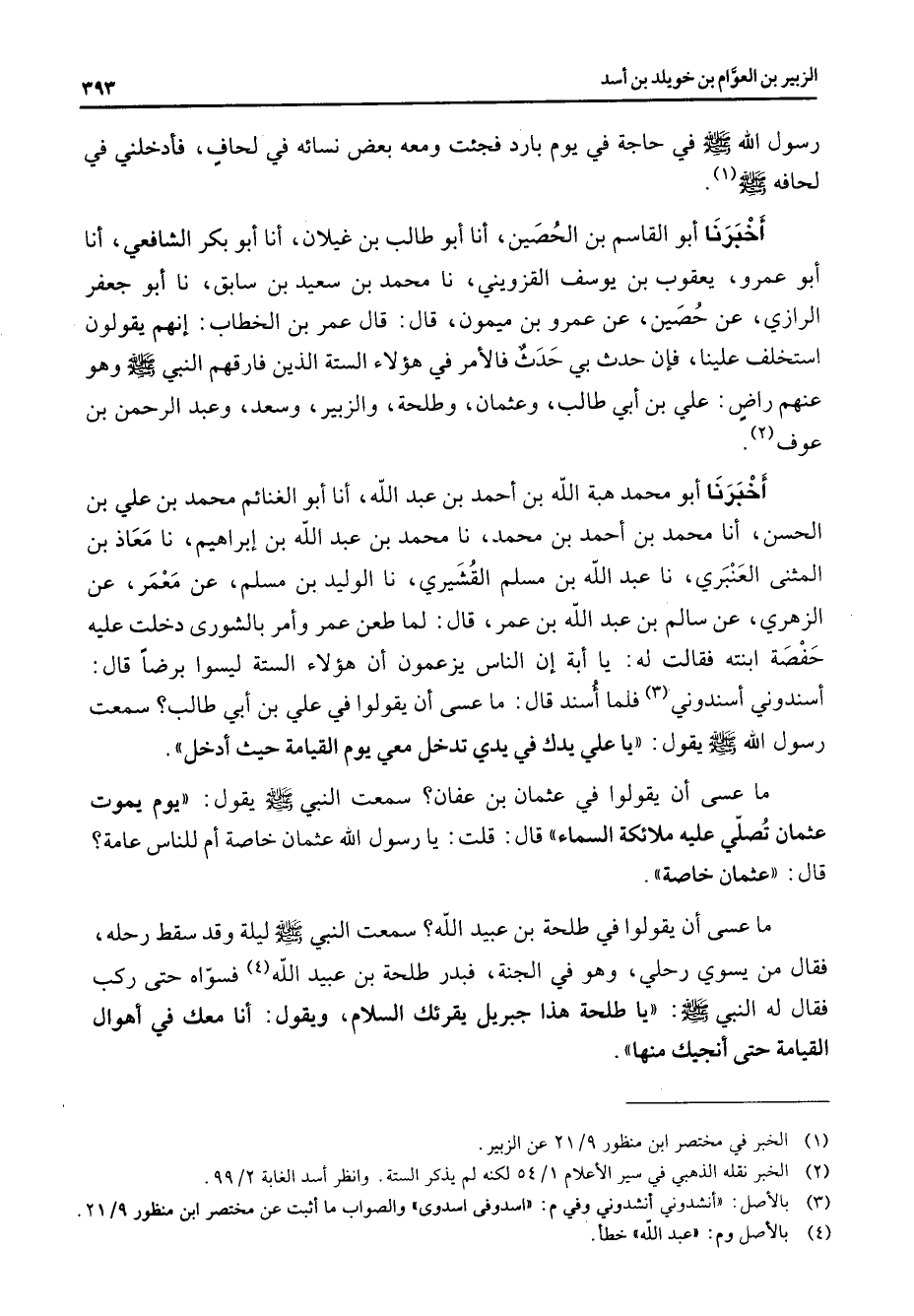 رسول الله (صلى الله عليه وسلم) في حاجة في يوم بارد فجئت ومعه بعض نسائه في لحاف فأدخلني في لحافه (صلى الله عليه وسلم) (1) أخبرنا أبو القاسم بن الحصين أنا أبو طالب بن غيلان أنا أبو بكر الشافعي أنا أبو عمرو يعقوب بن يوسف القزويني نا محمد بن سعيد بن سابق نا أبو جعفر الرازي عن حصين عن عمرو بن ميمون قال قال عمر بن الخطاب إنهم يقولون استخلف علينا فإن حدث بي حدث فالأمر في هؤلاء الستة الذين فارقهم النبي (صلى الله عليه وسلم) وهو عنهم راض علي بن أبي طالب وعثمان وطلحة والزبير وسعد وعبد الرحمن بن عوف (2) أخبرنا أبو محمد بن أحمد بن عبد الله أنا أبو الغنائم محمد بن علي بن الحسن أنا محمد بن أحمد بن محمد نا محمد بن عبد الله بن إبراهيم نا معاذ بن المثنى العنبري نا عبد الله بن مسلم القشيري نا الوليد بن مسلم عن معمر عن الزهري عن سالم بن عبد الله بن عمر قال لما طعن عمر وأمر بالشورى دخلت عليه حفصة ابنته فقالت له يا أبة إن الناس يزعمون أن هؤلاء الستة ليسوا برضا قال أسندوني أسندوني (3) فلما أسند قال ما عسى أن يقولوا في علي بن أبي طالب سمعت رسول الله (صلى الله عليه وسلم) يقول يا علي يدك في يدي تدخل معي يوم القيامة حيث أدخل ما عسى أن يقولوا في عثمان بن عفان سمعت النبي (صلى الله عليه وسلم) يقول يوم يموت عثمان تصلي عليه ملائكة السماء قال قلت يا رسول الله عثمان خاصة أم للناس عامة قال عثمان خاصة ما عسى أن يقولوا في طلحة بن عبيد الله سمعت النبي (صلى الله عليه وسلم) ليلة وقد سقط رحله فقال من يسوي رحلي وهو في الجنة فبدر طلحة بن عبيد الله (4) فسواه حتى ركب فقال له النبي (صلى الله عليه وسلم) يا طلحة هذا جبريل يقرئك السلام ويقول أنا معك في أهوال القيامة حتى أنجيك منها
