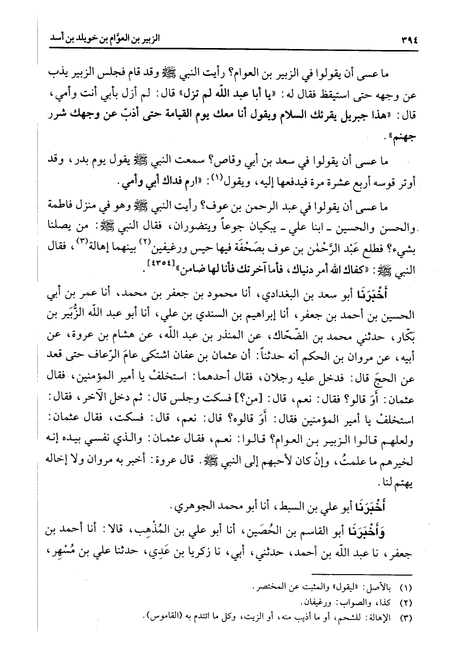ما عسى أن يقولوا في الزبير بن العوام رأيت النبي (صلى الله عليه وسلم) وقد قام فجلس الزبير يذب عن وجهه حتى استيقظ فقال له يا أبا عبد الله لم تزل قال لم أزل بأبي أنت وأمي قال هذا جبريل يقرئك السلام ويقول أنا معك يوم القيامة حتى أذب عن وجهك شرر جهنم ما عسى أن يقولوا في سعد بن أبي وقاص سمعت النبي (صلى الله عليه وسلم) يقول يوم بدر وقد أوتر قوسه أربع عشرة مرة فيدفعها إليه ويقول (1) ارم فداك أبي وأمي ما عسى أن يقولوا في عبد الرحمن بن عوف رأيت النبي (صلى الله عليه وسلم) وهو في منزل فاطمة والحسن والحسين ابنا علي يبكيان جوعا ويتضوران فقال النبي (صلى الله عليه وسلم) من يصلنا بشئ فطلع عبد الرحمن بن عوف بصحفة فيها حيس ورغيفين (2) بينهما إهالة (3) فقال النبي (صلى الله عليه وسلم) كفاك الله أمر دنياك فأما آخرتك فأنا لها ضامن أخبرنا أبو سعد بن البغدادي أنا محمود بن جعفر بن محمد أنا عمر بن أبي الحسين بن أحمد بن جعفر أنا إبراهيم بن السندي بن علي أنا أبو عبد الله الزبير بن بكار حدثني محمد بن الضحاك عن المنذر بن عبد الله عن هشام بن عروة عن أبيه عن مروان بن الحكم أنه حدثنا أن عثمان بن عفان اشتكى عام الرعاف حتى قعد عن الحج قال فدخل عليه رجلان فقال أحدهما استخلف يا أمير المؤمنين فقال عثمان أو قالوا فقال نعم قال من فسكت وجلس قال ثم دخل الآخر فقال استخلف يا أمير المؤمنين فقال أو قالوه قال نعم قال فسكت فقال عثمان ولعلهم قالوا الزبير بن العوام قالوا نعم فقال عثمان والذي نفسي بيده إنه لخيرهم ما علمت وإن كان لأحبهم إلى النبي (صلى الله عليه وسلم) قال عروة أخبر به مروان ولا إخاله يهتم لنا أخبرنا أبو علي بن البسط أنا أبو محمد الجوهري وأخبرنا أبو القاسم بن الحصين أنا أبو علي بن المذهب قالا أنا أحمد بن جعفر نا عبد الله بن أحمد حدثني أبي نا زكريا بن عدي حدثنا علي بن مسهر