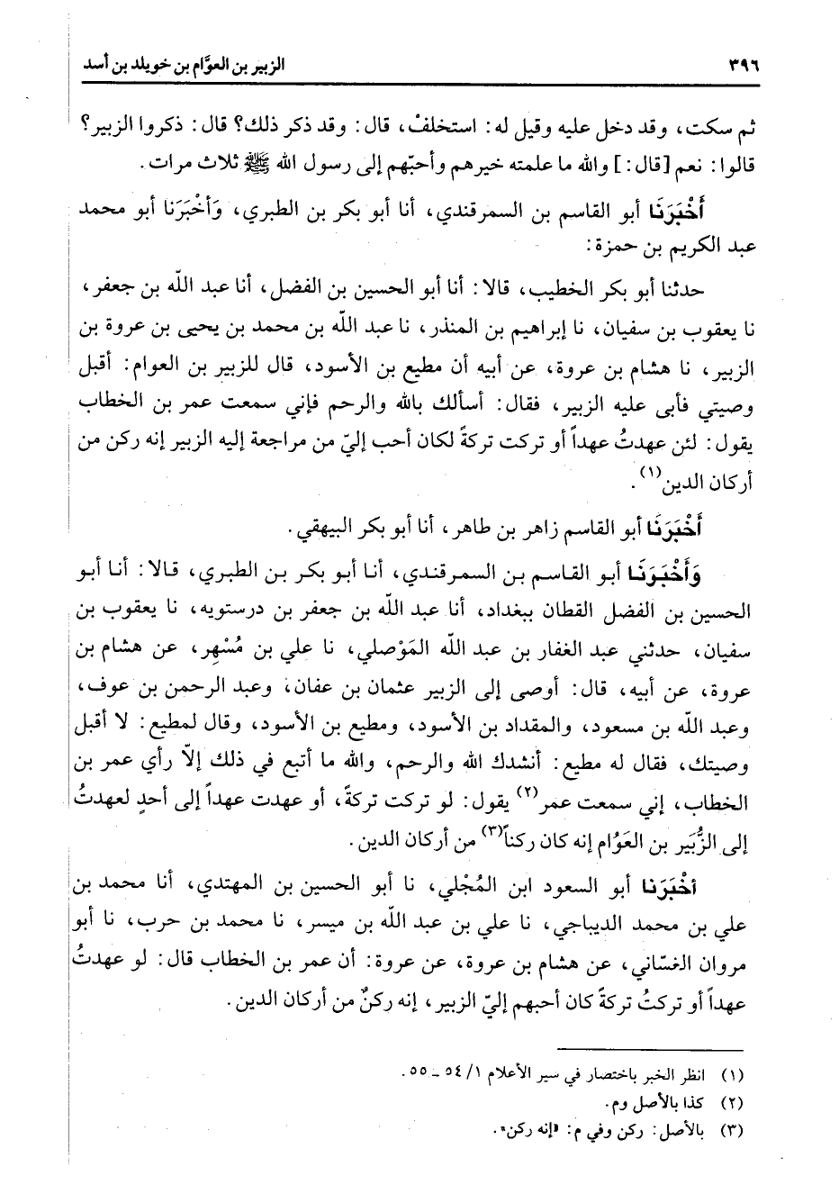 ثم سكت وقد دخل عليه وقيل له استخلف قال وقد ذكر ذلك قال ذكروا الزبير قالوا نعم قال والله ما علمته خيرهم وأحبهم إلى رسول الله (صلى الله عليه وسلم) ثلاث مرات أخبرنا أبو القاسم بن السمرقندي أنا أبو بكر بن الطبري وأخبرنا أبو محمد عبد الكريم بن حمزة حدثنا أبو بكر الخطيب قالا أنا أبو الحسين بن الفضل أنا عبد الله بن جعفر نا يعقوب بن سفيان نا إبراهيم بن المنذر نا عبد الله بن محمد بن يحيى بن عروة بن الزبير نا هشام بن عروة عن أبيه أن مطيع بن الأسود قال للزبير بن العوام أقبل وصيتي فأبى عليه الزبير فقال أسألك بالله والرحم فإني سمعت عمر بن الخطاب يقول لئن عهدت عهدا أو تركت تركة لكان أحب إلي من مراجعة إليه الزبير إنه ركن من أركان الدين (1) أخبرنا أبو القاسم زاهر بن طاهر أنا أبو بكر البيهقي وأخبرنا أبو القاسم بن السمرقندي أنا أبو بكر بن الطبري قالا أنا أبو الحسين بن الفضل القطان ببغداد أنا عبد الله بن جعفر بن درستويه نا يعقوب بن سفيان حدثني عبد الغفار بن عبد الله الموصلي نا علي بن مسهر عن هشام بن عروة عن أبيه قال أوصى إلى الزبير عثمان بن عفان وعبد الرحمن بن عوف وعبد الله بن مسعود والمقداد بن الأسود ومطيع بن الأسود وقال لمطيع لا أقبل وصيتك فقال له مطيع أنشدك الله والرحم والله ما أتبع في ذلك إلا رأي عمر بن الخطاب إني سمعت عمر (2) يقول لو تركت تركة أو عهدت عهدا إلى أحد لعهدت إلى الزبير بن العوام إنه كان ركنا (3) من أركان الدين أخبرنا أبو السعود ابن المجلي نا أبو الحسين بن المهتدي أنا محمد بن علي بن محمد الديباجي نا علي بن عبد الله بن ميسر نا محمد بن حرب نا أبو مروان الغساني عن هشام بن عروة عن عروة أن عمر بن الخطاب قال لو عهدت عهدا أو تركت تركة كان أحبهم إلي الزبير إنه ركن من أركان الدين