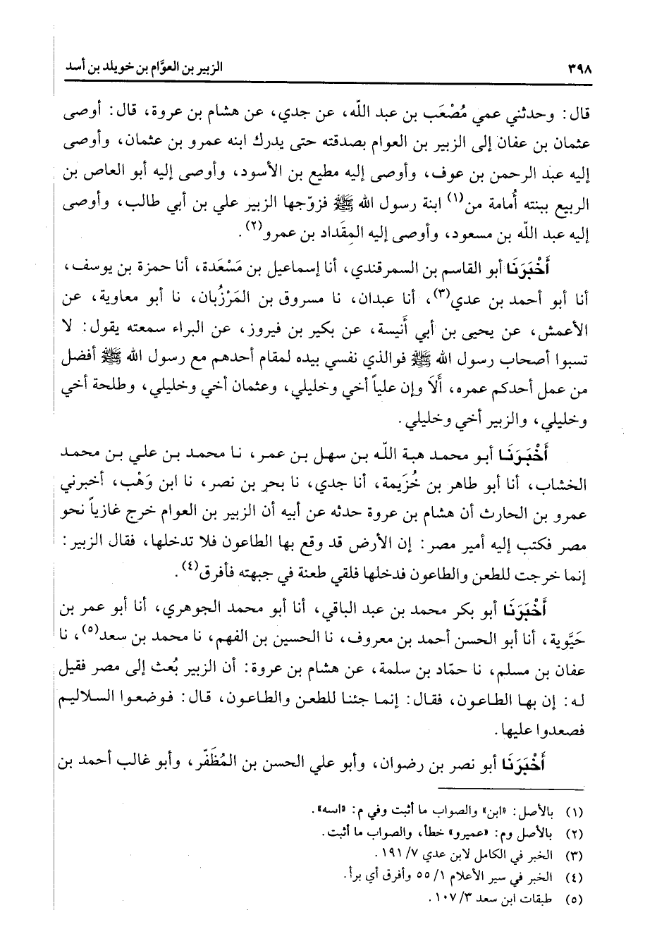 قال وحدثني عمي مصعب بن عبد الله عن جدي عن هشام بن عروة قال أوصى عثمان بن عفان إلى الزبير بن العوام بصدقته حتى يدرك ابنه عمرو بن عثمان وأوصى إليه عبد الرحمن بن عوف وأوصى إليه مطيع بن الأسود وأوصى إليه أبو العاص بن الربيع ببنته أمامة من (1) ابنة رسول الله (صلى الله عليه وسلم) فزوجها الزبير علي بن أبي طالب وأوصى إليه عبد الله بن مسعود وأوصى إليه المقداد بن عمرو (2) أخبرنا أبو القاسم بن السمرقندي أنا إسماعيل بن مسعدة أنا حمزة بن يوسف أنا أبو أحمد بن عدي (3) أنا عبدان نا مسروق بن المزربان نا أبو معاوية عن الأعمش عن يحيى بن أبي أنيسة عن بكير بن فيروز عن البراء سمعته يقول لا تسبوا أصحاب رسول الله (صلى الله عليه وسلم) فوالذي نفسي بيده لمقام أحدهم مع رسول الله (صلى الله عليه وسلم) أفضل من عمل أحدكم عمره ألا وإن عليا أخي وخليلي وعثمان أخي وخليلي وطلحة أخي وخل يلي والزبير أخي وخليلي أخبرنا أبو محمد هبة الله بن سهل بن عمر نا محمد بن علي بن محمد الخشاب أنا أبو طاهر بن خزيمة أنا جدي نا بحر بن نصر نا ابن وهب أخبرني عمرو بن الحارث أن هشام بن عروة حدثه عن أبيه أن الزبير بن العوام خرج غازيا نحو مصر فكتب إليه أمير مصر إن ألأرض قد وقع بها الطاعون فلا تدخلها فقال الزبير إنما خرجت للطعن والطاعون فدخلها فلقي طعنة في جبهته فأفرق (4) أخبرنا أبو بكر محمد بن عبد الباقي أنا أبو محمد الجوهري أنا أبو عمر بن حيوية أنا أبو الحسن أحمد بن معروف نا الحسين بن الفهم نا محمد بن سعد (5) نا عفان بن مسلم نا حماد بن سلمة عن هشام بن عروة أن الزبير بعث إلى مصر فقيل له إن بها الطاعون فقال إنما جئنا للطعن والطاعون قال فوضعوا السلاليم فصعدوا عليها أخبرنا أبو نصر بن رضوان وأبو علي الحسن بن المظفر وأبو غالب أحمد بن