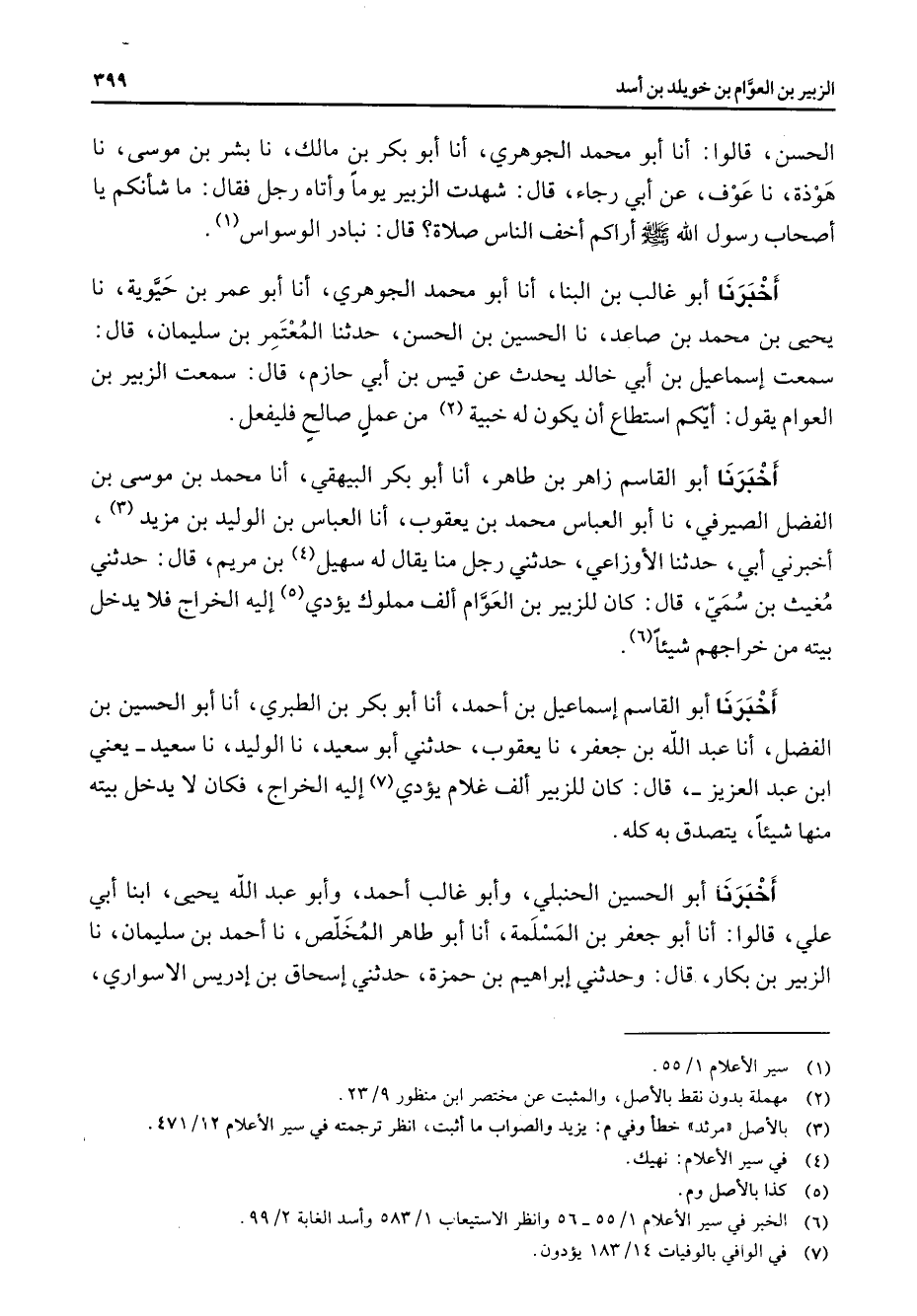 الحسن قالوا أنا أبو محمد الجوهري أنا أبو بكر بن مالك نا بشر بن موسى نا هوذة نا عوف عن أبي رجاء قال شهدت الزبير يوما وأتاه رجل فقال ما شأنكم يا أصحاب رسول الله (صلى الله عليه وسلم) أراكم أخف الناس صلاة قال نبادر الوسواس (1) أخبرنا أبو غالب بن البنا أنا أبو محمد الجوهري أنا أبو عمر بن حيوية نا يحيى بن محمد بن صاعد نا الحسين بن الحسن حدثنا المعتمر بن سليمان قال سمعت إسماعيل بن أبي خالد يحدث عن قيس بن أبي حازم قال سمعت الزبير بن العوام يقول أيكم استطاع أن يكون له خبية (3) من عمل صالح فليفعل أخبرنا أبو القاسم زاهر بن طاهر أنا أبو بكر البيهقي أنا محمد بن موسى بن الفضل الصيرفي نا أبو العباس محمد بن يعقوب أنا العباس بن الوليد بن مزيد (3) أخبرني أبي حدثنا الأوزاعي حدثني رجل منا يقال له سهيل (4) بن مريم قال حدثني مغيث بن سمي قال كان للزبير بن العوام ألف مملوك يؤدي (5) إليه الخراج فلا يدخل بيته من خراجهم شيئا (6) أخبرنا أبو القاسم إسماعيل بن أحمد أنا أبو بكر بن الطبري أنا أبو الحسين بن الفضل أنا عبد الله بن جعفر نا يعقوب حدثني أبو سعيد نا الوليد نا سعيد يعني ابن عبد العزيز قال كان الزبير ألف غلام يؤدي (7) إليه الخراج فكان لا يدخل بيته منها شيئا يتصدق به كله أخبرنا أبو الحسين الحنبلي وأبو غالب أحمد وأبو عبد الله يحيى ابنا أبي علي قالوا أنا أبو جعفر بن المسلمة أنا أبو طاهر المخلص نا أحمد بن سليمان نا الزبير بن بكار قال وحدثني إبراهيم بن حمزة حدثني إسحاق بن إدريس الاسواري
