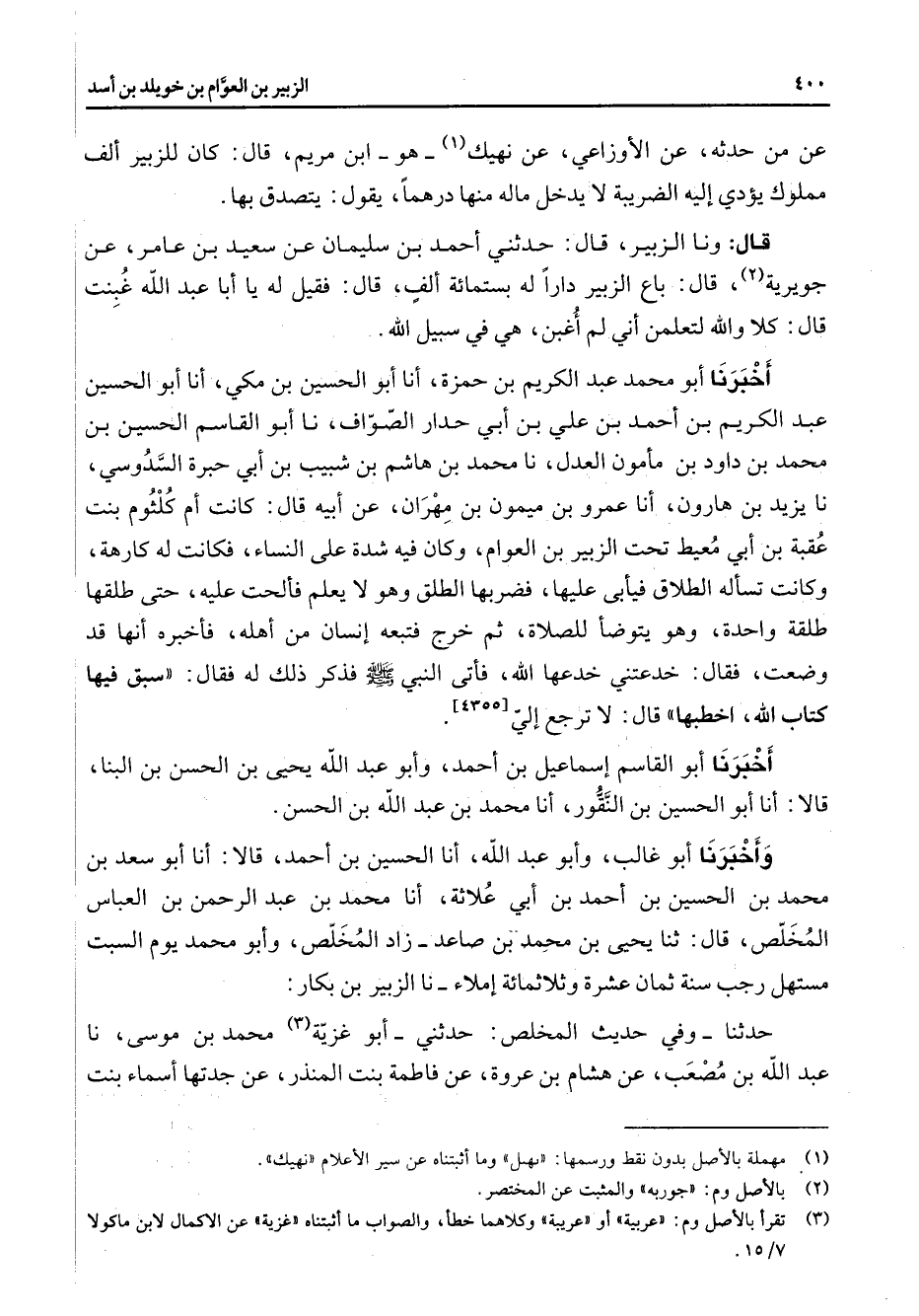 عن من حدثه عن الأوزاعي عن نهيك (1) هو ابن مريم قال كان للزبير ألف مملوك يؤدي إليه الضريبة لا يدخل ماله منها درهما يقول يتصدق بها قال ونا الزبير قال حدثني أحمد بن سليمان عن سعيد بن عامر عن جويرية (2) قال باع الزبير دارا له بستمائة ألف قال فقيل له يا أبا عبد الله غبنت قال كلا والله لتعلمن أني لم أغبن هي في سبيل الله أخبرنا أبو محمد عبد الكريم بن حمزة أنا أبو الحسين بن مكي أنا أبو الحسين عبد الكريم بن أحمد بن علي حدار الصواف نا أبو القاسم الحسين بن محمد بن داود بن مأمون العدل نا محمد بن هاشم بن شبيب بن أبي حمزة السدوسي نا يزيد بن هارون أنا عمرو بن ميمون بن مهران عن أبيه قال كانت أم كلثوم بنت عقبة بن أبي معيط تحت الزبير بن العوام وكان فيه شدة على النساء فكانت له كارهة وكانت تسأله الطلاق فيأبى عليها فضربها الطلق وهو لا يعلم فألحت عليه حتى طلقها طلقة واحدة وهو يتوضأ للصلاة ثم خرج فتبعه إنسان من أهله فأخبره أنها قد وضعت فقال خدعتني خدعها الله فأتى النبي (صلى الله عليه وسلم) فذكر ذلك له فقال سبق فيها كتاب الله اخطبها قال لا ترجع إلي أخبرنا أبو القاسم إسماعيل بن أحمد وأبو عبد الله يحيى بن الحسن بن البنا قالا أنا أبو الحسين بن النقور أنا محمد بن عبد الله بن الحسن وأخبرنا أبو غالب وأبو عبد الله أنا الحسين بن أحمد قالا أنا أبو سعد بن حمد بن الحسين بن أحمد بن أبي علاثة أنا محمد بن عبد الرحمن بن العباس المخلص قال ثنا يحيى بن محمد بن صاعد زاد المخلص وأبو محمد يوم السبت مستهل رجب سنة ثمان عشرة وثلاثمائة إملاء نا الزبير بن بكار حدثنا وفي حديث المخلص حدثني أبو غزية (3) محمد بن موسى نا عبد الله بن مصعب عن هشام بن عروة عن فاطمة بنت المنذر عن جدتها أسماء بنت
