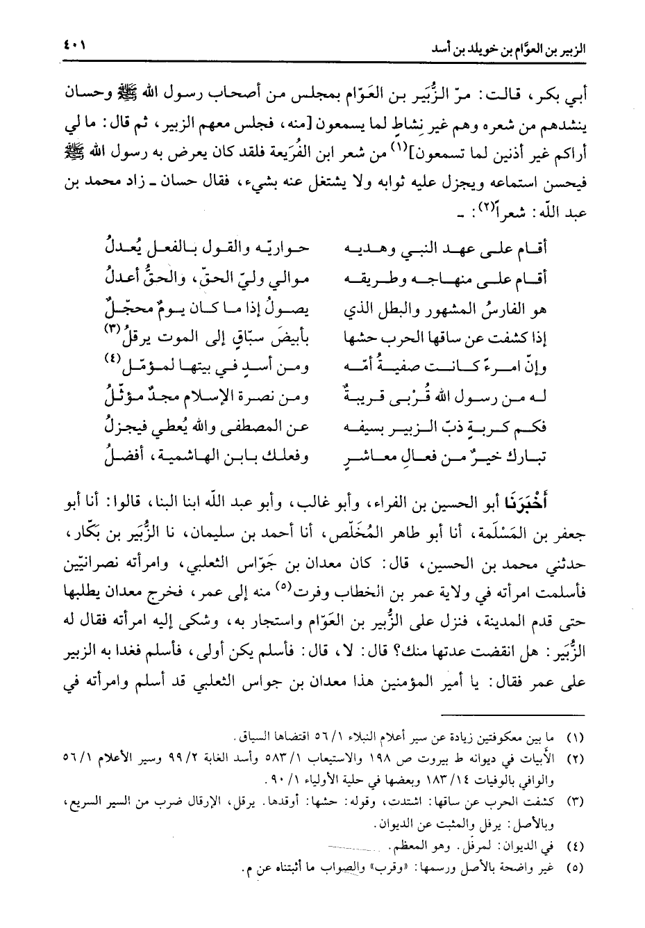 أبي بكر قالت مر الزبير بن العوام بمجلس من أصحاب رسول الله (صلى الله عليه وسلم) وحسان ينشدهم من شعره وهم غير نشاط لما يسمعون منه فجلس معهم الزبير ثم قال ما لي اراكم غير أذنين لما تسمعون (1) من شعر ابن الفريعة فلقد كان يعرض به رسول الله (صلى الله عليه وسلم) فيحسن استماعه ويجزل عليه ثوابه ولا يشتغل عنه بشئ فقال حسان زاد محمد بن عبد الله شعرا (2) أقام على عهد النبي وهديه * حواريه والقول بالفعل يعدل أقام على منهاجه وطريقه * موالي ولي الحق والحق أعدل هو الفارس المشهور والبطل الذي * يصول إذا ما كان يوم محجل إذا كشفت عن ساقها الحرب حشها * بأبيض سباق إلى الموت يرقل (3) وإن امرء كانت صفية أمه * ومن أسد في بيتها لمؤمل (4) له من رسول الله قربى قريبة * ومن نصرة الإسلام مجد مؤثل فكم كربة ذب الزبير بسيفه * عن المصطفى والله يعطي فيجزل تبارك خير من فعال معاشر * وفعلك بابن الهاشمية أفضل * أخبرنا أبو الحسن بن الفراء وأبو غالب وأبو عبد الله ابنا البنا قالوا أنا أبو جعفر بن المسلمة أنا أبو طاهر المخلص أنا أحمد بن سليمان نا الزبير بن بكار حدثني محمد بن الحسين قال كان معدان بن جواس الثعلبي وامرأته نصرانيين فأسلمت امرأته في ولاية عمر بن الخطاب وفرت (5) منه إلى عمر فخرج معدان يطلبها حتى قدم المدينة فنزل على الزبير بن العوام واستجار به وشكى إليه امرأته فقال له الزبير هل انقضت عدتها منك قال لا قال فأسلم يكن أولى فأسلم فغدا به الزبير على عمر فقال يا أمير المؤمنين هذا معدان بن جواس الثعلبي قد أسلم وامرأته في