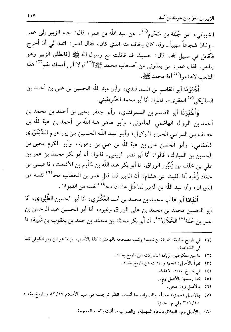 الشيباني عن جبلة بن سحيم (1) عن عبد الله بن عمر قال جاء الزبير إلى عمر وكان شجاعا مهيبا وقد كان يخاف منه الذي كان فقال لعمر ائذن لي ان أخرج فأقاتل في سبيل الله قال حسبك قد قاتلت مع رسول الله (صلى الله عليه وسلم) فانطلق الزبير وهو يتذمر فقال عمر من يعذرني من أصحاب محمد (صلى الله عليه وسلم) (2) لولا أني أمسك بفم (3) هذا الشعب لا هدموا (4) أمة محمد (صلى الله عليه وسلم) أخبرنات أبو القاسم بن السمرقندي وأبو عبد الله الحسين بن علي بن أحمد بن الساليكي (5) المقرئ قالوا أنا أبو محمد الصريفيني وأخبرنا أبو القاسم بن السمرقندي وأبو جعفر يحيى بن أحمد بن محمد بن أحمد بن الروال الهاشمي المأموني وأبو طاهر هبة الله بن أحمد هبة الله بن عطاف بن البرامي الحرار الوكيل وأبو عبد الله الحسين بن إبراهيم الدينوري الحمامي وأبو الحسن علي بن هبة الله بن علي بن رهوية وأبو الكرم يحيى بن الحسين بن المبارك قالوا أنا أبو نصر الزينبي قالوا أنا أبو بكر محمد بن عمر بن علي بن خلف بن زنبور الوراق نا أبو نا أبو بكر عبد الله بن سليم بن الأشعث نا عيسى بن حماد زغبه أنا الليث عن هشام أن الزبير لما قتل عمر بن الخطاب محا (6) نفسه من الديوان وأن عبد الله بن الزبير لما قتل عثمان محا (6) نفسه من الديوان أنبأنا أبو غالب محمد بن محمد بن أسد العكبري أنأأبو الحسين الطيوري أنا أبو الحسين محمد بن محمد بن علي الوراق وغيره أنا أبو الحسين عبد الرحمن بن عمر بن حمة (7) الخلال (8) أنا أبو بكر محمد بن محمد بن حمد بن يعقوب بن شيبة نا