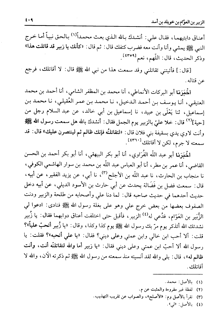 أعناق دابتيهما فقال علي أنشدك بالله الذي بعث محمدا (1) بالحق نبيا أما خرج النبي (صلى الله عليه وسلم) يمشي وأنا وأنت معه فضرب كتفك قال ثم قال كأنك يا زبير قد قاتلت هذا وذكر الحديث قال اللهم نعم قال فأتيتني تقاتلني وقد سمعت هذا من نبي الله (صلى الله عليه وسلم) قال لا أقاتلك فرجع عن قتاله أخبرنا أبو البركات الأنماطي أنا محمد بن المظفر الشامي أنا أحمد بن محمد العتيقي أنا يوسف بنأحمد الدخيل نا محمد بن عمر العقيلي نا محمد بن إسماعيل ثنا يعلى بن عبيد نا إسماعيل بن أبي خالد عن عبد السلام رجل من حية (2) قال خلا علي بالزبير يوم الجمل فقال أنشدك بالله هل سمعت رسول الله (صلى الله عليه وسلم) وأنت لاوي يدي بسقيفة بني فلان قال لتقاتلنه فإنك ظالم ثم لينتصرن عليك قال قد سمعته لا جرم لكن لا أقاتلك أخبرنا أبو عبد الله الفراوي أنا أبو بكر البيهقي أنا أبو بكر أحمد بن الحسن القاضي أنا عمر بن مطر أنا أبو العباس عبد الله بن محمد بن سوار الهاشمي الكوفي نا منجاب بن الحارث نا عبد الله بن الأجلح (3) نا أبي عن يزيد الفقير عن أبيه قال سمعت فضل بن فضالة يحدث عنأبي حارث بن الأسود الديلي عن أبيه دخل حديث أحدهما في حديث صاحبه قال لما دنا علي وأصحابه من طلحة والزبير ودنت الصفوف بعضها من بعض خرج علي وهو على بغلة رسول الله (صلى الله عليه وسلم) فنادى ادعوا لي الزبير بن العوام فدعي له (4) فأقبل حتى اختلفت أعناق دوابهما فقال يا زبير نشدتك الله أتذكر يوم مر بك رسول الله (صلى الله عليه وسلم) يوم كذاوكذا وقال يا زبير أتحب عليا قلت ألا أحب ابن خالي وابن عمتي وعلى ديني فقال يا علي أتحبه فقلت يا رسول الله ألا أحب ابن عمتي وعلى ديني فقال يا زبير أما والله لتقاتلنه أنت وأنت ظالم له قال بلى والله لقد أنسيته منذ سمعته من رسول الله (صلى الله عليه وسلم) ثم ذكرته الآن والله لا أقاتلك