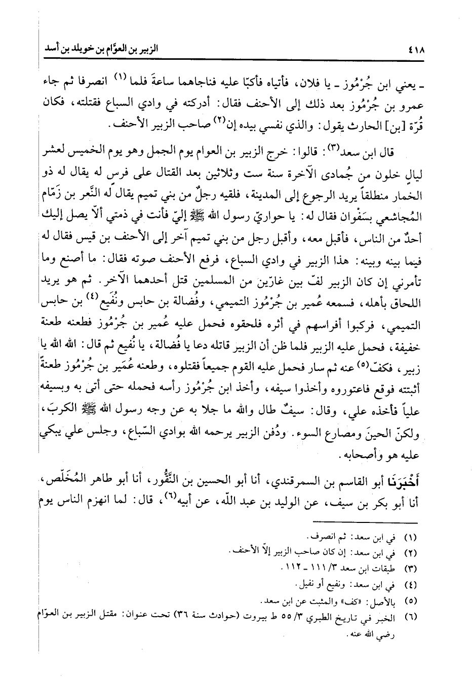 (6) الخبر في تاريخ الطبري 3 / 55 ط بيروت (حوادث سنة 36) تحت عنوان: مقتل الزبير بن العوام Bهـ