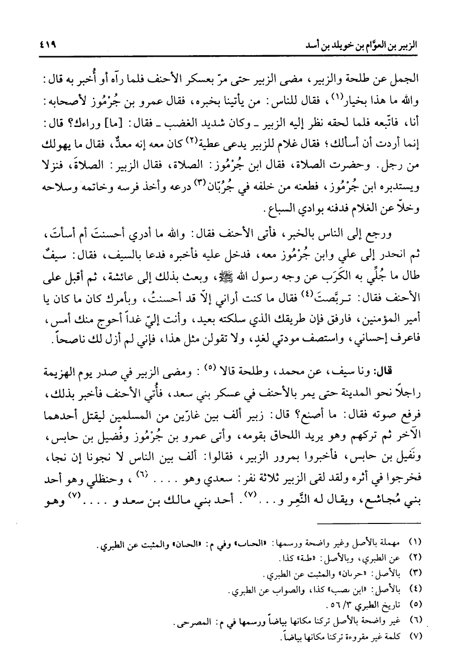 الجمل عن طلحة والزبير مضى الزبير حتى مر بعسكر الأحنف فلما رآه أو أخبر به قال والله ما هذا بخيار (1) فقال الناس من يأتينا بخبره فقال عمرو بن جرموز لأصحابه أنا فاتبعه فلما لحقه نظر إليه الزبير وكان شديد الغضب فقال ما وراءك قال إنما أردت أن أسألك فقال غلام للزبير يدعى عطية (2) كان معه إنه معد فقال ما يهولك من رجل وحضرت الصلاة فقال ابن جرموز فطعنه من خلفه في جربان (3) درعه وأخذ فرسه وخاتمه وسلاحه وخلا عن الغلام فدفنه بوادي السباع ورجع إلى الناس بالخبر فأتى الأحنف فقال والله ما أدري أحسنت أم أسأت ثم انحدر إلى علي وابن جرموز معه فدخل عليه فأخبره فدعا بالسيف فقال سيف طال ما جلي به الكرب عن وجه رسول الله (صلى الله عليه وسلم) وبعث بذلك إلى عائشة ثم أقبل على الأحنف فقال تربصت (4) فقال ما كنت أراني إلا قد أحسنت وبأمرك كان ما كان يا أمير المؤمنين فارفق فإن طريقك الذي سلكته بعيد وأنت إلي غدا أحوج منك أمس فاعرف إحساني واستصف مودتي لغد ولا تقولن مثل هذا فإني لم أزل لك ناصحا قال ونا سيف عن محمد وطلحة قالا (5) ومضى الزبير في صدر يوم الهزيمة راجلا نحو المدينة حتى يمر بالأحنف في عسكر بني سعد فأتي الأحنف فأخبر بذلك فرفع صوته فقال ما أصنع قال زبير ألف بين غارين من المسلمين ليقتل أحدهما الآخر ثم تركهم وهو يريد اللحاق بقومه وأتى عمرو بن جرموز وفضيل بن حابس ونفيل بن حابس فأخبروا بمرور الزبير فقالوا ألف بين الناس لا نجونا إن نجا فخرجوا في إثره ولقد لقى الزبير ثلاثة نفر سعدي وهو (6) وحنظلي وهو أحد بني مجاشع ويقال له النعر (7) وأحد بني مالك بن سعد و (7) وهو