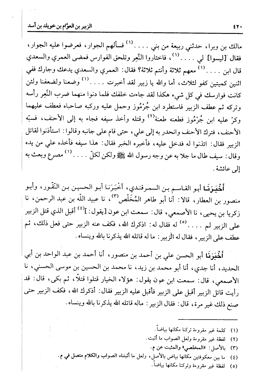 مالك بن وبرا حدثني ربيعة من بني (1) فسألهم الجوار فعرضوات عليه الجوار فقال ليسوا لي (1) فاختاروا النعر وتلحق الفوارس فمضى العمري والسعدي قال ابن (1) معهم ثلاثة وأنتم ثلاثة فقال العمري والسعدي يدعك وجارك ففي اثنين كميتين كفو لثلاث أما والله يا زبير لقد أخبرت (1) وضعنا ولضعفنا ولئن كانت فوارسك في كل شئ هكذا لقد جاءت خلفك فلما دنوا منهما ضرب النعر رأسه وتركه ثم عطف الزبير فاستطرد ابن جرموز وحمل عليه وركبه صاحباه فعطف عليهما وكر عليه ابن جرموز فطعنه طعنة (2) وقتله وأخذ سيفه فجاء به إلى الأحنف فسبه الأحنف فترك الأحنف وانحدر به إلى علي حتى قام على جانبه وقالوا استأذنوا لقاتل الزبير فقال ائذنوا له فدخل عليه فأخبره الخبر فقال هذا سيفه فأخذه علي من يده وقال سيف طال ما جلا به عن وجه رسول الله (صلى الله عليه وسلم) ولكن لكل (1) مصرع وبعث به إلى عائشة أخبرنا أبو القاسم بن السمرقندي أخبرنا أبو الحسين بن النقور وأبو منصور بن العطار قالا أنا أبو طاهر المخلص (3) نا عبيد الله بن عبد الرحمن نا زكريا بن يحيى نا الأصمعي قال سمعت ابن عون يقول (4) أقبل الذي قتل الزبير على الزبير لم (5) له فقال له اذكرك الله فكف عنه الزبير حتى فعل ذلك ثم عطف على الزبير فقال له الزبير ما له قاتله الله يذكرنا بالله وينساه أخبرنا أبو الحسن علي بن أحمد بن منصور أنا أحمد بن عبد الواحد بن أبي الحديد ج أنا جدي أنا أبو محمد بن زيد نا محمد بن الحسين بن موسى الحسني نا الأصمعي قال سمعت ابن عون يقول هؤلاء الخيار قتلوا قتلا ثم بكى قال قد رأيت قاتل الزبير أقبل على الزبير فأقبل عليه الزبير فقال أذكرك الله فكف الزبير حتى صنع ذلك غير مرة قال فقال الزبير ماله قاتله الله يذكرنا بالله وينساه