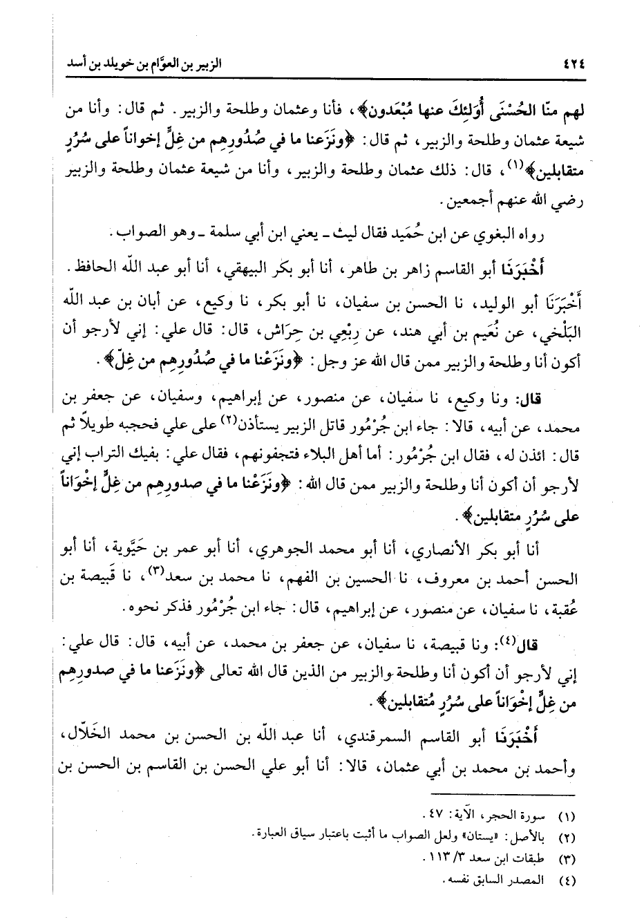 " " لهم منا الحسنى أولئك عنها مبعدون " فأنا وعثمان وطلحة والزبير ثم قال وأنا من شيعة عثمان وطلحة والزبير ثم قال " ونزعنا ما في صدورهم من غل إخوانا على سرر متقابلين " (1) قال ذلك عثمان وطلحة والزبير وأنا شيعة من عثمان وطلحة والزبير Bهم أجمعين رواه البغوي عن ابن حميد فقال ليث يعني ابن أبي سلمة وهو الصواب أخبرنا أبو القاسم زاهر بن طاهر أنا أبو بكر البيهقي أنا أبو عبد الله الحافظ أخبرنا أبو الوليد نا الحسن بن سفيان نا أبو بكر نا وكيع عن أبان بن عبد الله البلخي عن نعيم بن أبي أهند عن ربعي بن حراش قال قال علي إني لأرجو أن أكون أنا وطلحة والزبير ممن قال الله عز وجل " ونزعنا ما في صدورهم من غل " قال ونا وكيع نا سفيان عن منصور عن إبراهيم وسفيان عن جعفر بن محمد عن أبيه قالا جاء ابن جرموز قاتل الزبير يستأذن (2) على علي فحجبه طويلا ثم قال ائذن له فقال ابن جرموز أنا أهل البلاء فتجفونهم فقال علي بفيك التراب إني لأرجو أن أكون أنا وطلحة والزبير ممن قال الله " ونزعنا ما في صدورهم من غل إخوانا على سرر متقابلين " أنا أبو بكر الأنصاري أنا أبو محمد الجوهري أنا أبو عمر بن حيوية أنا أبو الحسن أحمد بن معروف نا الحسين بن الفهم نا محمد بن سعد (3) نا قبيصة بن عقبة نا سفيان عن منصور عن إبراهيم قال جاء ابن جرموز فذكر نحوه قال (4) ونا قبيصة نا سفيان عن جعفر بن محمد عن أبيه قال قال علي إني لأرجو أن أكون أنا وطلحة والزبير من الذين قال الله تعالى " ونزعنا ما في صدورهم من غل إخوانا على سرر متقابلين " أخبرنا أبو القاسم السمرقندي أنا عبد الله بن الحسن بن محمد الخلال وأحمد بن محمد بن أبي عثمان قالا أنا أبو علي الحسن بن القاسم بن الحسن بن