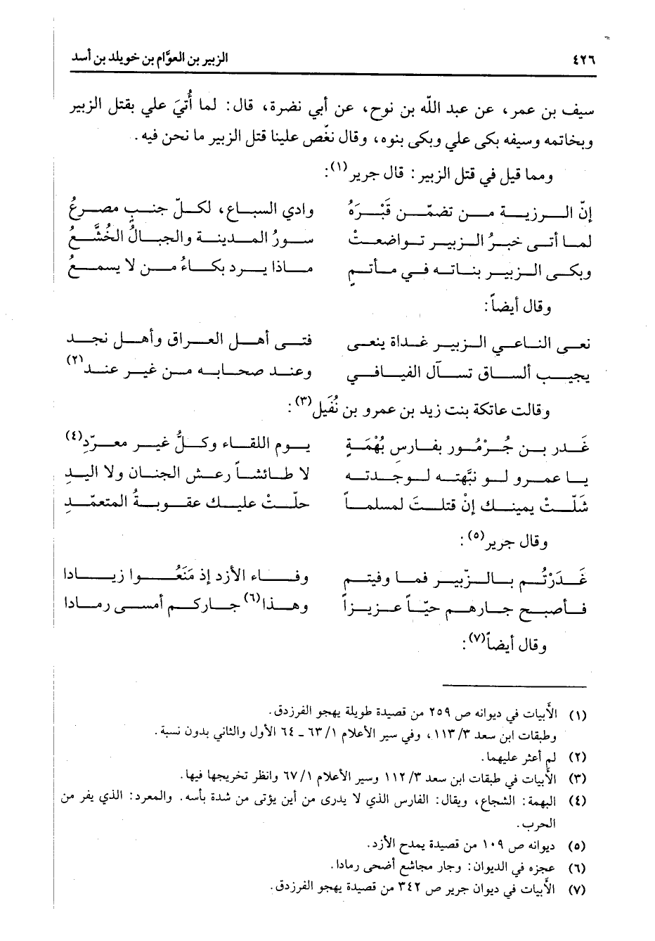 سيف بن عمر عن عبد الله بن نوح عن أبي نضرة قال لما أتي علي بقتل الزبير وبخاتمه وسيفه بكى علي وبكى بنوه وقال نغص علينا قتل الزبير ما نحن فيه ومما قيل في قتل الزبير قال جرير (1) * إن الرزية من تضمن قبره * وادي السباع لكل جنب مصرع لما أتى خبر الزبير تواضعت * سور المدينة والجبال الخشع وبكى الزبير بناته في مأتم * ماذا يرد بكاء من لا يسمع * وقال أيضا * نعى الناعي الزبير غداة ينعى * فتى أهل العراق وأهل نجد يجيب الساق تسأل الفيافي * وعند صحابه من غير عند (2) * وقالت عاتكة بنت زيد بن عمرو بن نفيل (3) * غدر بن جرمور بفارس بهمة * يوم اللقاء وكل غير معرد (4) يا عمرو لو نبهته لو وجدته * لا طائشا رعش الجنان ولا اليد شلت يمينك إن قتلت لمسلما * حلت عليك عقوبة المتعمد * وقال جرير (5) * غدرتم بالزبير فما وفيتم * وفاء الأزد إذ منعوا زيادا فأصبح جارهم حيا عزيزا * وهذا (6) جاركم أمسى رمادا * وقال أيضا (7)