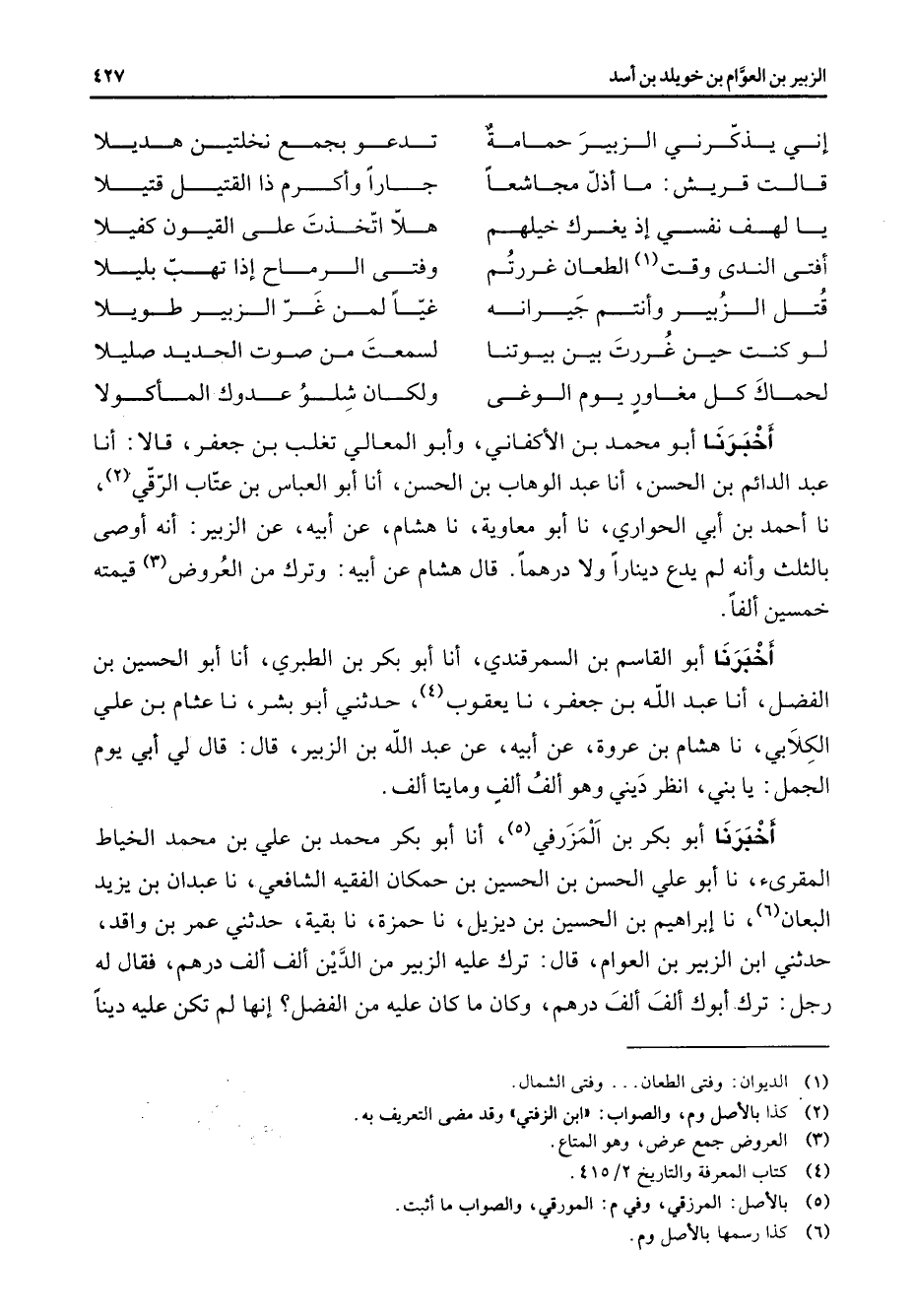 * إني يذكرني الزبير حمامة * تدعو بجمع نخلتين هديلا قالت قريش ما أذل مجاشعا * جارا وأكرم ذا القتيل قتيلا يا لهف نفسي إذ يغرك خيلهم * هلا اتخذت على القيون كفيلا أفتى الندى وقت (1) الطعان غررتم * وفتى الرماح إذا تهب بليلا قتل الزبير وأنتم جيرانه * غيا لمن غر الزبير طويلا لو كنت حين غررت بين بيوتنا * لسمعت من صوت الحديد صليلا لحماك كل مغاور يوم الوغى * ولكان شلو عدوك المأكولا * أخبرنا أبو محمد بن الأكفاني وأبو المعالي تغلب بن جعفر قالا أنا عبد الدائم بن الحسن أنا عبد الوهاب بن الحسن أنا أبو العباس بن عتاب الرقي (2) نا أحمد بن أبي الحواري نا أبو معاوية نا هشام عن أبيه عن الزبير أنه أوصى بالثلث وأنه لم يدع دينارا ولا درهما قال هشام عن أبيه وترك من العروض (3) قيمته خمسين ألفا أخبرنا أبو القاسم بن السمرقندي أنا أبو بكر بن الطبري أنا أبو الحسين بن الفضل أنا عبد الله بن جعفر نا يعقوب حدثني أبو بشر نا عثام بن علي الكلابي نا هشام بن عروة عن أبيه عن عبد الله بن الزبير قال قال لي أبي يوم الجمل يا بني انظر ديني وهو ألف ألف ومايتا ألف أخبرنا أبو بكر المزرفي (5) أنا أبو بكر محمد بن علي بن محمد الخياط المقرئ نا أبو علي الحسن بن الحسين بن حمكان الفقيه الشافعي نا عبدان بن يزيد البعان (6) نا إبراهيم بن الحسين بن ديزيل نا حمزة نا بقية حدثني عمر بن واقد حدثني ابن الزبير بن العوام قال ترك عليه الزبير من الدين ألف ألف درهم فقال له رجل ترك أبوك ألف ألف درهم وكان ما كان عليه من الفضل إنها لم تكن عليه دينا