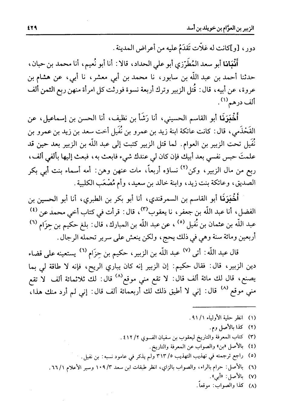 دور وكانت له غلات تقدم عليه من أعراض المدينة أنبأنا أبو سعد المطرزي أبو علي الحداد قالا أنا أبو نعيم أنا محمد بن حبان حدثنا أحمد بن عبد الله بن سابور نا محمد بن أبي معشر نا أبي عن هشام بن عروة عن أبيه قال قتل الزبير وترك أربعة نسوة فورثت كل امرأة منهن ربع الثمن ألف ألف درهم (1) أخبرنا أبو القاسم الحسيني أنا رشأ بن نظيف أنا الحسن بن إسماعيل عن القحذمي قال كانت عاتكة ابنة زيد بن عمرو بن نفيل أخت سعد بن زيد بن عمرو بن نفيل تحت الزبير بن العوام لما قتل الزبير كتبت إلى عبد الله بن الزبير بعد حين قد علمت حبس نفسي بعد أبيك فإن كان لي عندك شئ فابعث به فبعث إليها بألفي ألف ربع من مال الزبير وكن (2) نساؤه أربعا مات عنهن وهن أمه أسماء بنت أبي بكر الصديق وعاتكة بنت زيد وابنة خالد بن سعيد وأم مصعب الكلبية أخبرنا أبو القاسم بن السمرقندي أنا أبو بكر بن الطبري أنا أبو الحسين بن الفضل أنا عبد الله بن جعفر نا يعقوب (3) قال قرأت في كتاب أخي محمد عن (4) عبد الله بن عثمان بن نفيل (5) عن عبد الله بن المبارك قال بلغ حكيم بن حزام (6) أربعين ومائة سنة وهي في ذلك يحج ولكن ينعش على سرير تحمله الرجال قال عبد الله أتى (7) عبد الله بن الزبير حكيم بن حزام (8) يستعينه على قضاء دين الزبير قال فقال حكيم إن الزبير إنه كان يباري الريح فإنه لا طاقة لي بما يصنع قال لك مائة ألف قال لا تقع مني موقع (8) قال لك ثلاثمائة ألف لا تقع مني موقع (8) قال إني لا أطيق ذلك لك أربعمائة ألف قال إني لم أرد منك هذا