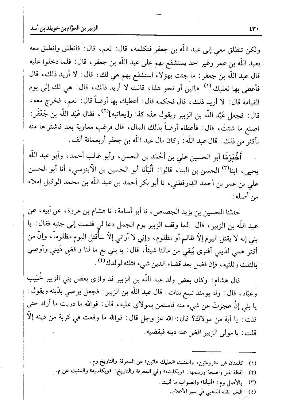 ولكن تنطلق معي إلى عبد الله بن جعفر فتكلمه قال نعم قال فانطلق وانطلق معه بعبد الله بن عمر وغير أحد يستشفع بهم على عبد الله بن جعفر قال فلما دخلوا عليه قال عبد الله بن جعفر ما جئت بهؤلاء استشفع بهم هي لك قال لا أريد ذلك قال فأعطى بها نعليك (1) هاتين أو نحو هذا قالت لا أريد ذلك قال هي لك إلى يوم القيامة قال لا أريد ذلك قال فحكمه قال أعطيك بها أرضا قال نعم فخرج معه قال فجعل عبد الله بن الزبير ويقول هذه كذا ويعاتبه (2) فقال عبد الله بن جعفر اصنع ما شئت قال فأعطاه أرضا بذلك المال قال فرغب معاوية بعد فاشتراها منه بأكثر من ذلك قال عبد الله وكان مال عبد الله بن جعفر أربعمائة ألف أخبرنا أبو الحسين علي بن أحمد بن الحسن وأبو غالب أحمد وأبو عبد الله يحيى ابنا (3) الحسن بن البنا قالوا أنبأنا أبو الحسين بن الآبنوسي أنا أبو الحسن علي بن عمر بن أحمد الدارقطني نا أبو بكر أحمد بن عبد الله بن محمد الوكيل إملاء من أصله حدثنا الحسين بن يزيد الجصاص نا أبو أسامة نا هشام بن عروة عن أبيه عن عبد الله بن الزبير قال لما وقف الزبير يوم الجمل دعا لي فقمت إلى جنبه فقال يا بني غنه لا يقتل اليوم إلا ظالم وإني لا أراني إلا سأقتل اليوم مظلوما وإن من أكثر همي لديني أفترى يبقي من مالنا شيئا قال يا بني بع ما لنا واقض ديني وأوصي بالثلث وثلثيه فإن فضل بعد قضاء الدين شئ فثلثه لولدك قال هشام وكان بعض ولد عبد الله بن الزبير قد وازى بعض بني الزبير خبيب وعباد قال وله يومئذ تسع بنات قال عبد الله بن الزبير فجعل يوصي بدينه ويقول يا بني إن عجزت عن شئ منه فاستعن بمولاي عليه قال فوالله ما دريت ما أراد حتى قلت يا أبة من مولاك قال الله عز وجل قال فوالله ما وقعت في كربة من دينه إلا قلت يا مولى اقض عنه دينه فيقضيه