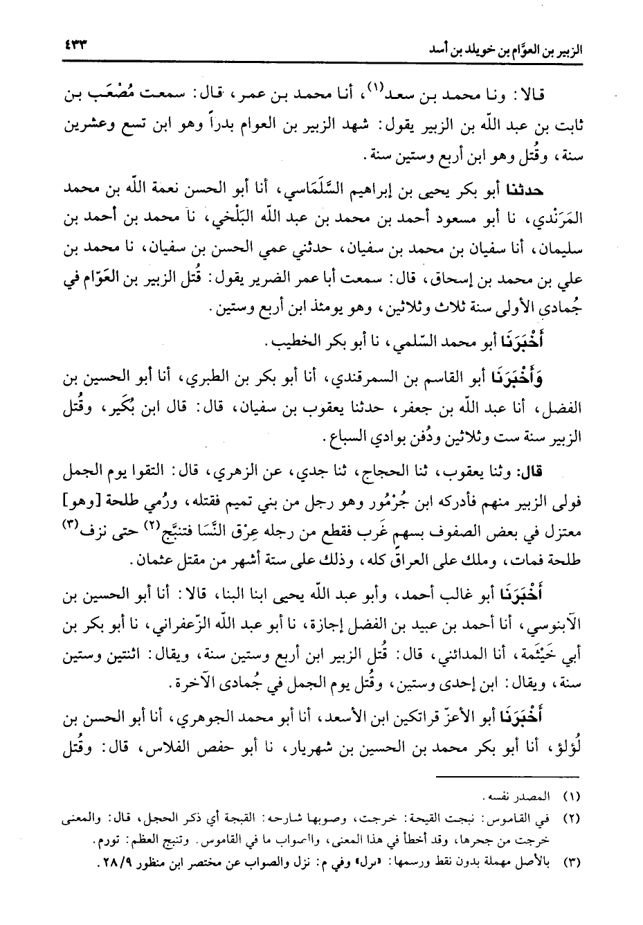 قالا ونا محمد بن سعد (1) أنا محمد بن عمر قال سمعت مصعب بن ثابت بن عبد الله بن الزبير يقول شهد الزبير بن العوام بدرا وهو ابن تسع وعشرين سنة وقتل هو ابن أربع وستين سنة حدثنا أبو بكر يحيى بن إبراهيم السلماسي أنا أبو نعمة الله بن محمد المرندي نا أبو مسعود أحمد بن محمد بن عبد الله البلخي نا محمد بن أحمد بن سليمان أنا سفيان بن محمد بن سفيان حدثني عمي الحسن بن سفيان نا محمد بن علي بن محمد بن إسحاق قال سمعت أبا عمر الضرير يقول قتل الزبير بن العوام في جمادى الأولى سنة ثلاث وثلاثين وهو يومئذ ابن أربع وستين أخبرنا أبو محمد السلمي نا أبو بكر الخطيب وأخبرنا أبو القاسم بن السمرقندي أنا أبو بكر بن الطبري أنا أبو الحسين بن الفضل أنا عبد الله بن جعفر حدثنا يعقوب بن سفيان قال قال ابن بكير وقتل الزبير سنة ست ولاثين ودفن بوادي السباع قال وثنا يعقوب ثنا الحجاج ثنا جدي عن الزهري قال التقوا يوم الجمل فولى الزبير منهم فأدركه ابن جرموز وهو رجل من بني تميم فقتله ورمي طلحة وهو معتزل في بعض الصفوف بسهم غرب فقطع من رجله عرق النسا فتنبج (2) حتى نزف (3) طلحة فمات وملك على العراق كله وذلك على ستة أشهر من مقتل عثمان أخبرنا أبو غالب أحمد وأبو عبد الله يحيى ابنا البنا قالا أنا أبو الحسين بن الآبنوسي أنا أحمد بن عبيد بن الفضل إجازة نا أبو عبد الله الزعفراني نا أبو بكر بن أبي خيثمة أنا المدائني قال قتل الزبير ابن أربع وستين سنة ويقال اثنتين وستين سنة ويقال ابن إحدى وستين وقتل يوم الجمل في جمادى الآخرة أخبرنا أبو الأعز قراتكين ابن الأسعد أنا أبو محمد الجوهري أنا أبو الحسن بن لؤلؤ أنا أبو بكر محمد بن الحسين بن شهريار نا أبو حفص الفلاس قال وقتل