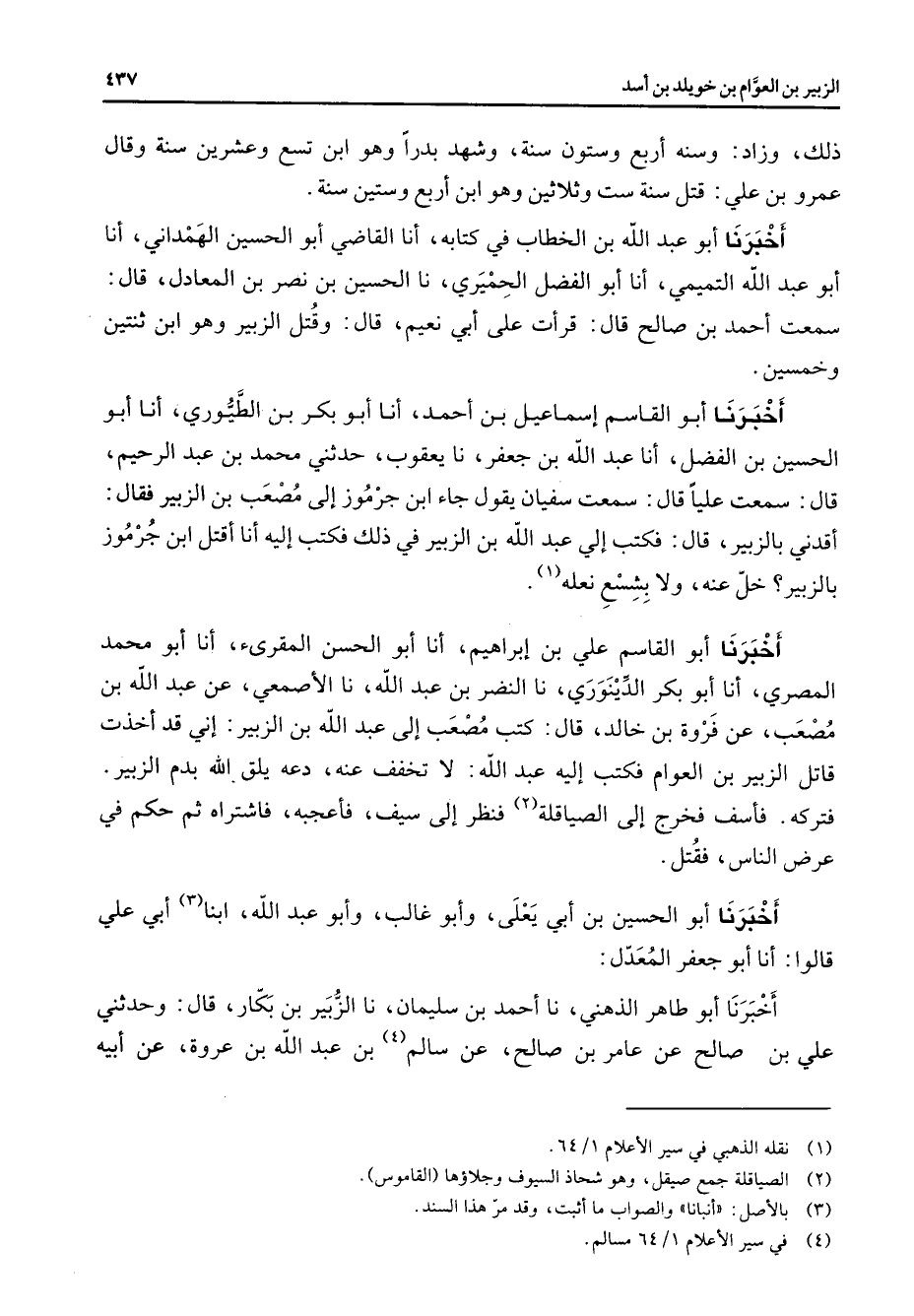 ذلك وزاد وسنه أربع وستون سنة وشهد بدرا وهو ابن تسع وعشرين سنة وقال عمرو بن علي قتل سنة ست وثلاثين وهو ابن أربع وستين سنة أخبرنا أبو عبد الله بن الخطاب في كتابه أنا القاضي أبو الحسين الهمداني أنا أبو عبد الله التميمي أنا أبو الفضل الحميري نا الحسين بن نصر بن المعادل قال سمعت أحمد بن صالح قال قرأت على أبي نعيم قال وقتل الزبير وهو ابن ثنتين وخمسين أخبرنا أبو القاسم إسماعيل بن أحمد أنا أبو بكر بن الطيوري أنا أبو الحسين بن الفضل أنا عبد الله بن جعفر نا يعقوب حدثني محمد بن عبد الرحيم قال سمعت عليا قال سمعت سفيان يقول جاء ابن جرموز إلى مصعب بن الزبير فقال أقدني بالزبير قال فكتب إلي عبد الله بن الزبير في ذلك فكتب إليه أنا أقتل ابن جرموز بالزبير خل عنه ولا بشسع نعله (1) أخبرنا أبو القاسم علي بن إبراهيم أنا أبو الحسن المقرئ أنا أبو محمد المصري أنا أبو بكر الدينوري نا النضر بن عبد الله نا الأصمعي عن عبد الله بن مصعب عن فروة بن خالد كتب مصعب إلى عبد الله بن الزبير إني قد أخذت قاتل الزبير بن العوام فكتب إليه عبد الله لا تخفف عنه دعه يلق الله بدم الزبير فتركه فأسف فخرج إلى الصياقلة (2) فنظر إلى سيف فأعجبه فاشتراه ثم حكم في عرض الناس فقتل أخبرنا أبو الحسين بن أبي يعلى وأبو غالب وأبو عبد الله ابنا (3) أبي علي قالوا أنا أبو جعفر المعدل أخبرنا أبو طاهر الذهني نا أحمد بن سليمان نا الزبير بن بكار قال وحدثني علي بن صالح عن عامر بن صالح عن سالم (4) بن عبد الله بن عروة عن أبيه