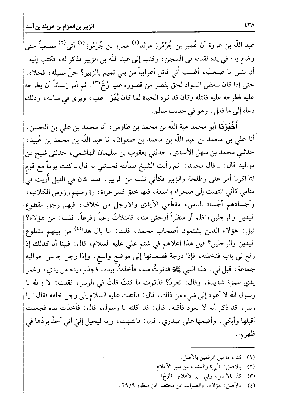 عبد الله بن عروة أن عمير بن جرموز مرثد (1) عمرو بن جرموز (1) أتى (2) مصعبا حتى وضع يده في يده فقذفه في السجن وكتب إلى عبد الله بن الزبير فذكر له فكتب إليه أن بئس ما صنعت أظننت أني قاتل أعرابيا من بني تميم بالزبير خل سبيله فخلاه حتى إذا كان ببعض السواد لحق بقصر من قصوره عليه رخ (3) ثم أمر إنسانا أن يطرحه عليه فطرحه عليه فقتله وكان قد كره الحياة لما كان يهول عليه ويرى في منامه وذلك دعاه إلى ما فعل وهو في حديث سالم أخبرنا أبو محمد هبة الله بن محمد بن طاوس أنا محمد بن علي بن الحسن أنا علي بن محمد بن عبد الله بن محمد بن صفوان نا عبد الله بن محمد بن عبيد حدثني محمد بن سهل الأسدي حدثني يعقوب بن سليمان الهاشمي حدثني شيخ من موالينا قال قال محمد ثم رأيت الشيخ فسألته فحدثني به قال كنت يوما مع قوم فتذاكرنا أمر علي وطلحة والزبير فكأني نلت من الزبير فلما كان في الليل أريت في منامي كأني انتهيت إلى صحراء واسعة فيها خلق كثير عراة رؤوسهم رؤوس الكلاب وأجسادهم أجساد الناس مقطعي الأيدي والأرجل من خلاف فيهم رجل مقطوع اليدين والرجلين فلم أر منظرا أوحش منه فامتلأت رعبا وفزعا قلت من هؤلاء قيل هؤلاء الذين يشتمون أصحاب محمد قلت ما بال هذا (4) من بينهم مقطوع اليدين والرجلين قيل هذا أعلاهم في شتم علي عليه السلام قال فبينا أنا كذلك إذ رفع لي باب فدخلته فإذا درجة فصعدتها إلى موضع واسع وإذا رجل جالس حواليه جماعة قيل لي هذا النبي (صلى الله عليه وسلم) فدنوت منه فأخذت بيده فجذب يده من يدي وغمز يدي غمزة شديدة وقال تعود فذكرت ما كنت قلت في الزبير فقلت لا والله يا رسول الله لا أعود إلى شئ من ذلك قال فالتفت عليه السلام إلى رجل خلفه فقال يا زبير قد ذكر أنه لا يعود فأقله قال قد أقلته يا رسول الله قال فأخذت يده فجعلت أقبلها وأبكي وأضعها على صدري قال فانتبهت وإنه ليخيل إلي أني أجد بردها في ظهري