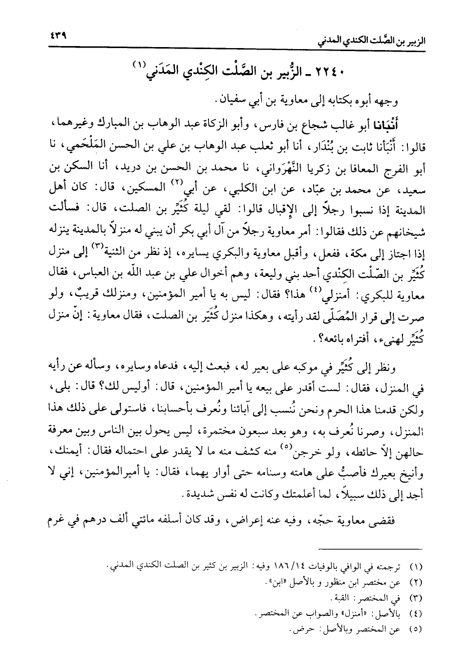2240 - الزبير بن الصلت الكندي المدني (1) وجهه أبوه بكتابه إلى معاوية بن أبي سفيان أنبأنا أبو غالب شجاع بن فارس وأبو الزكاة عبد الوهاب بن المبارك وغيرهما قالوا أنبأنا ثابت بن بندار أنا أبو ثعلب عبد الوهاب بن علي بن الحسن الملحمي نا أبو الفرج المعافا بن زكريا النهرواني نا محمد بن الحسن بن دريد أنا السكن بن سعيد عن محمد بن عباد عن ابن الكلبي عن أبي (2) المسكين قال كان أهل المدينة إذا نسبوا رجلا إلى الإقبال قالوا لقي ليلة كثير بن الصلت قال فسألت شيخانهم عن ذلك فقالوا أمر معاوية رجلا من آل أبي بكر أن يبني له منزلا بالمدينة ينزله إذا اجتاز إلى مكة ففعل وأقبل معاوية والبكري يسايره إذ نظر من الثنية (3) إلى منزل كثير بن الصلت الكندي أحد بني وليعة وهم أخوال علي بن عبد الله بن العباس فقال معاوية للبكري أمنزلي (4) هذا فقال ليس به يا أمير المؤمنين ومنزلك قريب ولو صرت إلى قرار المصلى لقد رأيته وهكذا منزل كثير بن الصلت فقال معاوية إن منزل كثير لهنئ أفتراه بائعه ونظر إلى كثير في موكبه على بعير له فبعث إليه فدعاه وسايره وسأله عن رأيه في المنزل فقال لست أقدر على بيعه يا أمير المؤمنين قال أو ليس لك قال بلى ولكن قدمنا هذا الحرم ونحن ننسب إلى آبائنا ونعرف بأحسابنا فاستولى على ذلك هذا المنزل وصرنا نعرف به وهو بعد سبعون مختمرة ليس يحول بين الناس وبين معرفة حالهن إلا حائطه ولو خرجن (5) منه كشف منه ما لا يقدر على احتماله فقال أيمنك وأنيخ بعيرك فأصب على هامته وسنامه حتى أوار يهما فقال يا أمير المؤمنين إني لا أجد إلى ذلك سبيلا لما أعلمتك وكانت له نفس شديدة فقضى معاوية حجه وفيه عنه إعراض وقد كان أسلفه مائتي ألف درهم في غرم
