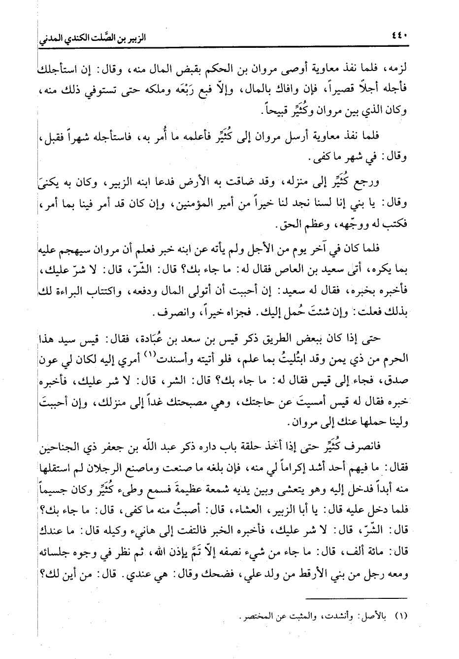 لزمه فلما نفذ معاوية أوصى مروان بن الحكم بقبض المال منه وقال إن استأجلك فأجله أجلا قصيرا فإن وافاك بالمال وإلا فبع ربعه وملكه حتى تستوفي ذلك منه وكان الذي بين مروان وكثير قبيحا فلما نفذ معاوية أرسل مروان إلى كثير فأعلمه ما أمر به فاستأجله شهرا فقبل وقال في شهر ما كفى ورجع كثير إلى منزله وقد ضاقت به الأرض فدعا ابنه الزبير وكان به يكنى وقال يا بني إنا لسنا نجد لنا خيرا من أمير المؤمنين وإن كان قد أمر فينا بما أمر فكتب له ووجهه وعظم الحق فلما كان في آخر يوم من الأجل ولم يأته عن ابنه خبر فعلم أن مروان سيهجم عليه بما يكره أتى سعيد بن العاص فقال له ما جاء بك قال الشر قال لا شر عليك فأخبره بخبره فقال له سعيد إن أحببت أن أتولى المال ودفعه واكتتاب البراءة لك بذلك فعلت وإن شئت حمل إليك فجزاه خيرا وانصرف حتى إذا كان ببعض الطريق ذكر قيس بن سعد بن عبادة فقال قيس سيد هذا الحرم من ذي يمن وقد ابتليت بما علم فلو أتيته وأسندت (1) أمري إليه لكان لي عون صدق فجاء إلى قيس فقال له ما جاء بك قال الشر لا شر عليك فأخبره خبره فقال له قيس أمسيت عن حاجتك وهي مصبحتك غدا إلى منزلك وإن أحببت ولينا حملها عنك إلى مروان فانصرف كثير حتى إذا أخذ حلقة باب داره ذكر عبد الله بن جعفر ذي الجناحين فقال ما فيهم أحد أشد كراما لي منه فإن بلغه ما صنعت وما صنع الرجلان لم استقلها منه أبدا فدخل وهو يتعشى وبين يديه شمعة عظيمة فسمع وطئ كثير وكان جسيما فلما دخل عليه قال يا أبا الزبير العشاء قال أصبت منه ما كفى قال ما جاء بك قال الشر قال لا شر عليك فأخبره الخبر فالتفت إلى هانئ وكيله قال ما عندك قال مائة ألف قال ما جاء من شئ نصفه إلا تم بإذن الله ثم نظر في وجوه جلسائه ومعه رجل من بني الأرقط من ولد علي فضحك وقال هي عندي قال من أين لك
