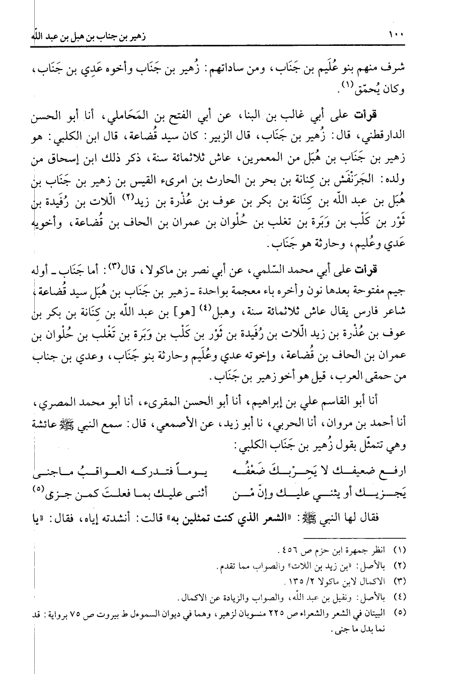 شرف منهم بنو عليم بن جناب ومن ساداتهم زهير بن جناب وأخوه عدي بن جناب وكان يحمق (1) قرأت على أبي غالب بن البنا عن أبي الفتح بن المحاملي أنا أبو الحسن الدارقطني قال زهير بن جناب قال الزبير كان سيد قضاعة قال ابن الكلبي هو زهير بن جناب بن هبل من المعمرين عاش ثلاثمائة سنة ذكر ذلك ابن إسحاق من ولده الجرنفش بن كنانة بن بحر بن الحارث بن امرئ القيس بن زهير بن جناب بن هبل بن عبد الله بن كنانة بن بكر بن عوف بن عذرة بن زيد (2) اللات بن رفيدة بن ثور بن كلب بن وبرة بن تغلب بن حلوان بن عمران بن الحاف بن قضاعة وأخويه عدي وعليم وحارثة هو جناب قرأت على أبي محمد السلمي عن أبي نصر بن ماكولا قال (3) أما جناب أوله جيم مفتوحة بعدها نون وأخره باء معجمة بواحدة زهير بن جناب بن هبل سيد قضاعة شاعر فارس يقال عاش ثلاثمائة سنة وهبل (4) هو بن عبد الله بن كنانة بن بكر بن عوف بن عذرة بن زيد اللات بن رفيدة بن ثور بن كلب بن وبرة بن تغلب بن حلوان بن عمران بن الحاف بن قضاعة وإخوته عدي وعليم وحارثة بنو جناب وعدي بن جناب من حمقى العرب قيل هو أخو زهير بن جناب أنا أبو القاسم علي بن إبراهيم أنا أبو الحسن المقرئ أنا أبو محمد المصري أنا أحمد بن مروان أنا الحربي نا أبو زيد عن الأصمعي قال سمع النبي (صلى الله عليه وسلم) عائشة وهي تتمثل بقول زهير بن جناب الكلبي * ارفع ضعيفك لا يحربك ضعفه * يوما فتدركه العواقب ما جنى يجزيك أو يثني عليك وإن من * أثنى عليك بما فعلت كمن جزى * (5) فقال لها النبي (صلى الله عليه وسلم) الشعر الذي كنت تمثلين به قالت أنشدته إياه فقال يا