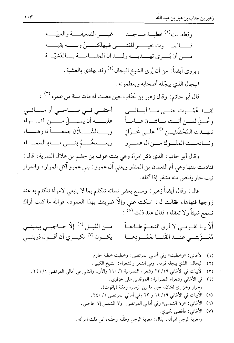 وقطعت (1) خطبة ماجد غير الضعيفة والعيية * فالموت خير للفتى فليهلكن وبه بقيه * من أن يرى تهديه ولدان المقامة بالعشية ويروى أيضا من أن يرى الشيخ البجال (2) وقد يهادى بالعشية البجال الذي يبجله أصحابه ويعظمونه قال أبو حاتم وقال زهير بن جناب حين مضت له مايتا سنة من عمره (3) * لقد عمرت حتى ما أبالي * احتفي في صباحي أو مسائي * * وحق لمن أتت مائتان عاما * عليه أن يمل من الثواء شهدت المحضئين (4) على خزاز * وبالسلان جمعا ذا زهاء ونادمت الملوك من آل عمرو * وبعدهم بني ماء السماء * وقال أبو حاتم الذي ذكر امرأة وهي بنت عوف بن جشم بن هلال النمرية قال فنادمت بنتها وهي أم النعمان بن المنذر ويعني آل عمرو بني عمرو آكل المرار والمرار نبت حار يقلص منه مشفر إذا أكله قال وقال أيضا زهير وسمع بعض نسائه تتكلم بما لا ينبغي لامرأة تتكلم به عند زوجها فنهاها فقالت له اسكت عني وإلا ضربتك بهذا العمود فوالله ما كنت أراك تسمع شيئا ولا تعقله فقال عند ذلك (5) * ألا يا لقومي لا أرى النجم طالعا * من الليل (6) إلا حاجبي بيميني معزبتي عند القفا بعمودها * يكون (7) نكيري أن أقول ذريني