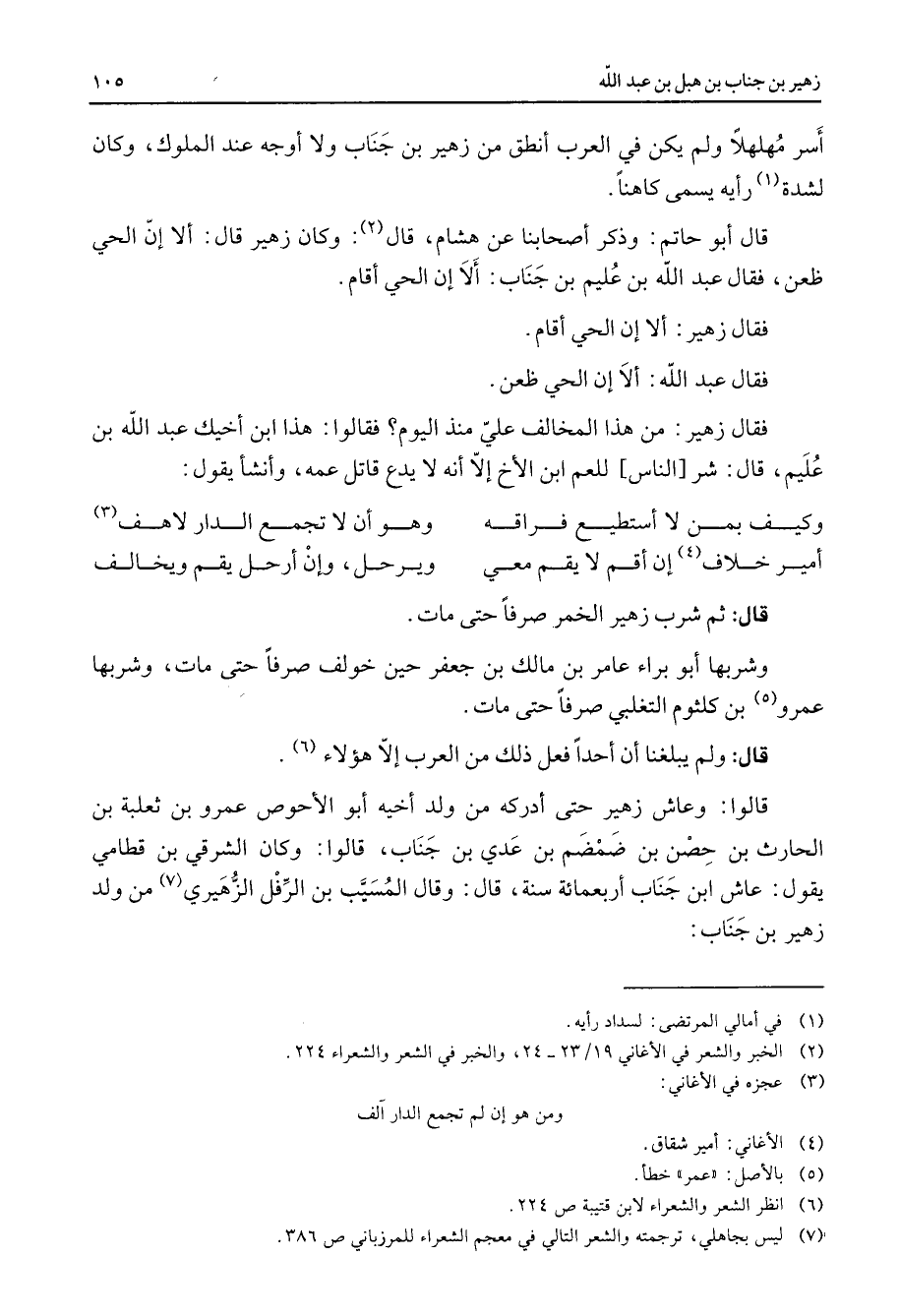 أسر مهلهلا ولم يكن في العرب أنطق من زهير بن جناب ولا أوجه عند الملوك وكان لشدة (1) رأيه يسمى كاهنا قال أبو حاتم وذكر أصحابنا عن هشام قال (2) وكان زهير قال ألا إن الحي ظعن فقال عبد الله بن عليم بن جناب ألا إن الحي أقام فقال زهير ألا إن الحي أقام فقال عبد الله ألا إن الحي ظعن فقال زهير من هذا المخالف علي منذ اليوم فقالوا هذا ابن أخيك عبد الله بن عليم قال شر الناس للعم ابن الأخ إلا أنه لا يدع قاتل عمه وأنشأ يقول * وكيف بمن لا أستطيع فراقه * وهو أن لا تجمع الدار لاهف (3) أمير خلاف (4) إن أقم لا يقم معي * ويرحل وإن أرحل يقم ويخالف * قال ثم شرب زهير الخمر صرفا حتى مات وشربها أبو براء عامر بن مالك بن جعفر حين خولف صرفا حتى مات وشربها عمرو (5) بن كلثوم التغلبي صرفا حتى مات قال ولم يبلغنا أن أحدا فعل ذلك من العرب إلا هؤلاء (6) قالوا وعاش زهير حتى أدركه من ولد أخيه أبو الأحوص عمرو بن ثعلبة بن الحارث بن حصن بن ضمضم بن عدي بن جناب قالوا وكان الشرقي بن قطامي يقول عاش ابن جناب أربعمائة سنة قال وقال المسيب بن الرفل الزهيري (7) من ولد زهير بن جناب