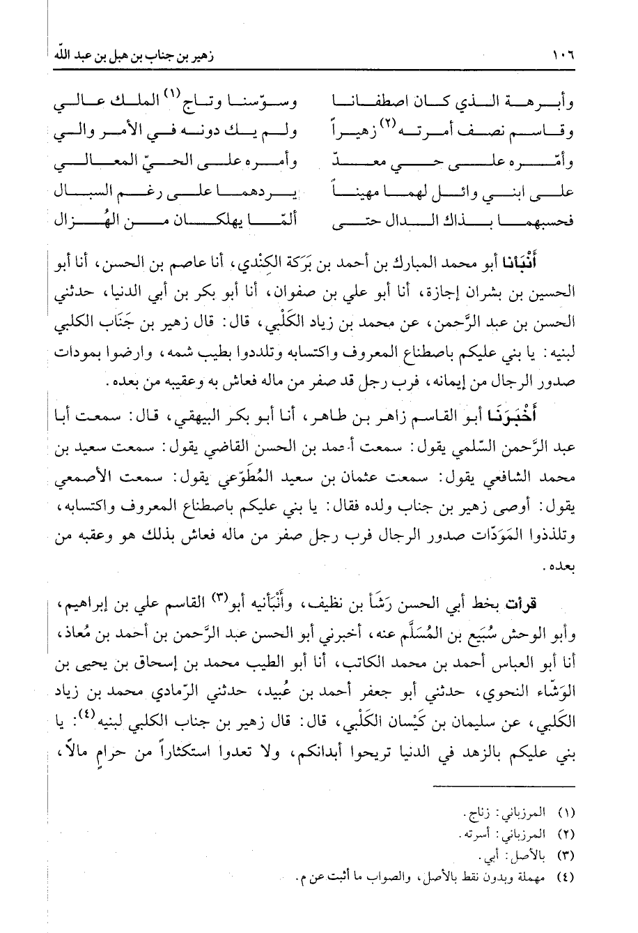 * وأبرهة الذي كان اصطفانا * وسوسنا وتاج (1) الملك عالي وقاسم نصف أمرته (2) زهيرا * ولم يك دونه في الأمر والي وأمره على حي معد * وأمره على الحي المعالي على ابني وائل لهما مهينا * يردهما على رغم السبال فحسبهما بذاك الدال حتى * ألما يهلكان من الهزال * أنبأنا أبو محمد المبارك بن أحمد بن بركة الكندي انا عاصم بن الحسن أنا أبو الحسين بن بشران إجازة أنا أبو علي بن صفوان أنا أبو بكر بن أبي الدنيا حدثني الحسن بن عبد الرحمن عن محمد بن زياد الكلبي قال قال زهير بن جناب الكلبي لبنيه يا بني عليكم باصطناع المعروف واكتسابه وتلددوا بطيب شمه وارضوا بمودات صدور الرجال من إيمانه فرب رجل قد صفر من ماله فعاش به وعقيبه من بعده أخبرنا أبو القاسم زاهر بن طاهر أنا أبو بكر البيهقي قال سمعت أبا عبد الرحمن السلمي يقول سمعت أحمد بن الحسن القاضي يقول سمعت سعيد بن محمد الشافعي يقول سمعت عثمان بن سعيد المطوعي يقول سمعت الأصمعي يقول أوصى زهير بن جناب ولده فقال يا بني عليكم باصطناع المعروف واكتسابه وتلذذوا المودات صدور الرجال فرب رجل صفر من ماله فعاش بذلك هو وعقبه من بعده قرأت بخط أبي الحسن رشأ بن نظيف وأنبأنيه أبو (3) القاسم علي بن إبراهيم وأبو الوحش سبيع بن المسلم عنه أخبرني أبو الحسن عبد الرحمن بن أحمد بن معاذ أنا أبو العباس أحمد بن محمد الكاتب أنا أبو الطيب محمد بن إسحاق بن يحيى بن الوشاء النحوي حدثني أبو جعفر أحمد بن عبيد حدثني الرمادي محمد بن زياد الكلبي عن سليمان بن كيسان الكلبي قال قال زهير بن جناب الكلبي لبنيه (4) يا بني عليكم بالزهد في الدنيا تريحوا أبدانكم ولا تعدوا استكثارا من حرام مالا