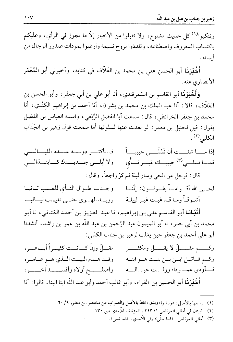 وتنكبوا (1) كل حديث مشنوع ولا تقبلوا من الأخبار إلا ما يجوز في الرأي وعليكم باكتساب المعروف واصطناعه وتلذذوا بروح نسيمة وارضوا بمودات صدور الرجال من أيمانه أخبرنا أبو الحسن علي بن محمد بن العلاف في كتابه وأخبرني أبو المعمر الأنصاري عنه وأخبرنا أبو القاسم بن السمرقندي أنا أبو علي بن أبي جعفر وأبو الحسن بن العلاف قالا أنا عبد الملك بن محمد بن بشران أنا أحمد بن إبراهيم الكندي أنا محمد بن جعفر الخرائطي قال سمعت أبا الفضل الربعي واسمه العباس بن الفضل يقول قيل لحنبل بن معمر لو بعدت عنها لسلوتها أما سمعت قول زهير بن الجناب الكلبي (2) * إذا ما شئت أن تسلى حبيبا * فأكثر دونه عدد الليالي فما تسلي (3) حبيبك غير نأي * ولا أبلى جديدك كابتذالي * قال فرحل عن الحي وسار ليلة ثم كر راجعا وقال * لحى الله أقواما يقولوا إننا * وجدنا طوال النأي للصب ثانيا أشوقا وما قد غبت غير لييلة * رويد الهوى حتى نغيب لياليا * أنبأنا أبو القاسم علي بن إبراهيم نا عبد العزيز بن أحمد الكتاني نا أبو محمد بن أبي نصر نا أبو الميمون عبد الرحمن بن عبد الله بن عمر بن راشد أنشدنا أبو علي أحمد بن جعفر حين يغلب لزهير بن جناب الكلبي * وكم مقل لا يقل ومكثر * مقل وإن كانت كثيرا أباعره وكم قاتل ابن بن بنت هو ابنه * وقد هدم البيت الذي هو عامره فأودى عموداه ورثت حباله * وأصلح أولاه وأفسد آخره * أخبرنا أبو الحسين بن الفراء وأبو غالب أحمد وأبو عبد الله ابنا البنا قالوا أنا
