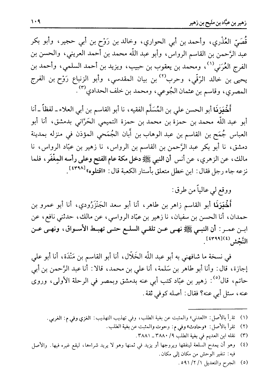 قصي العذري وأحمد بن أبي الحواري وخالد بن روح بن أبي حجير وأبو بكر عبد الرحمن بن القاسم الرواس وأبو عبد الله محمد بن أحمد العريني والحسن بن الفرج العرني (1) ومحمد بن يعقوب بن حبيب ويزيد بن أحمد السلمي وأحمد بن يحيى بن خالد الرقي وحرب (2) بن بيان المقدسي وأبو الزنباع روح بن الفرج المصري وقاسم بن عثمان الجوعي ومحمد بن خلف الحدادي (3) أخبرنا أبو الحسن علي بن المسلم الفقيه نا أبو القاسم بن أبي العلاء لفظا أنا أبو عبد الله محمد بن حمزة بن محمد بن حمزة التميمي الحراني بدمشق أنا أبو العباس جمح بن القاسم بن عبد الوهاب بن أبان الجمحي المؤذن في منزله بمدينة دمشق نا أبو بكر عبد الرحمن بن القاسم بن الرواس نا زهير بن عباد الرواس نا مالك عن الزهري عن أنس أن النبي (صلى الله عليه وسلم) دخل مكة عام الفتح وعلى رأسه المغفر فلما نزعه جاء رجل فقال ابن خطل متعلق بأستار الكعبة قال اقتلوه