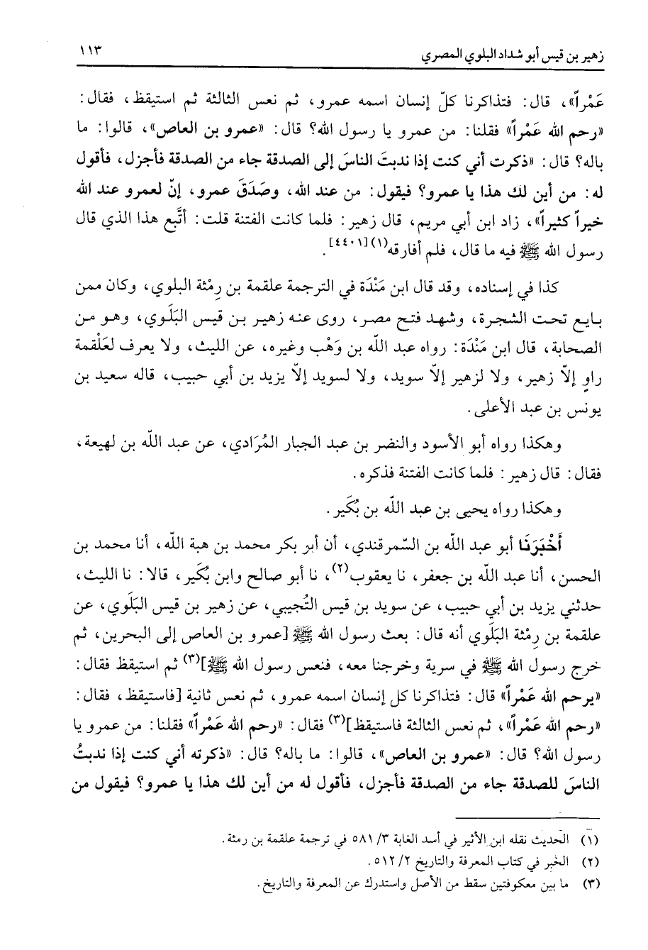 عمرا قال فتذاكرنا كل إنسان اسمه عمرو ثم نعس الثالثة ثم استيقظ فقال رحم الله عمرا فقلنا من عمرو يا رسول الله قال عمرو بن العاص قالوا ما باله قال ذكرت أني كنت إذا ندبت الناس إلى الصدقة جاء من الصدقة فأجزل فأقول له من أين لك هذا يا عمرو فيقول من عند الله وصدق عمرو إن لعمرو عند الله خيرا كثيرا زاد ابن أبي مريم قال زهير فلما كانت الفتنة قلت أتبع هذا الذي قال رسول الله (صلى الله عليه وسلم) فيه ما قال فلم أفارقه (1)