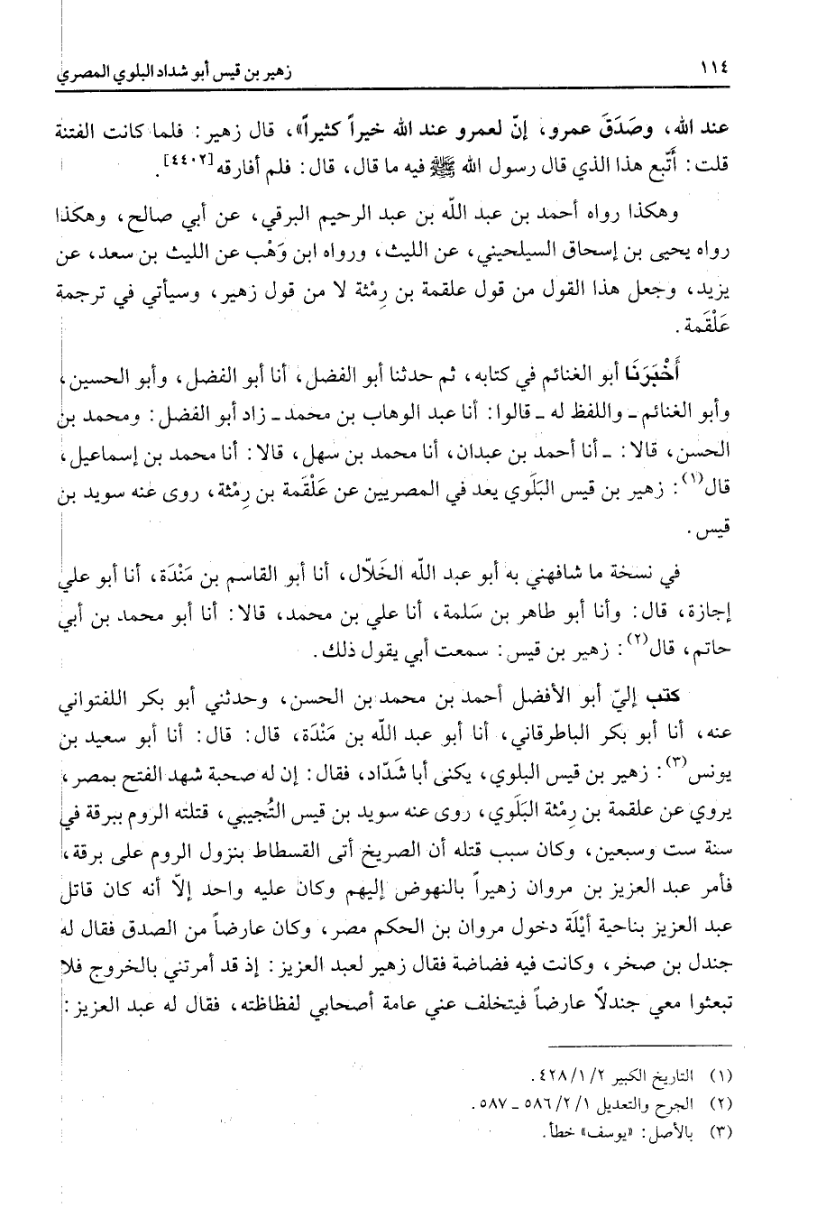 [4402] وهكذا رواه أحمد بن عبد الله بن عبد الرحيم البرقي عن أبي صالح وهكذا رواه يحيى بن إسحاق السيلحيني عن الليث ورواه ابن وهب عن الليث بن سعد عن يزيد وجعل هذا القول من قول علقمة بن رمثة لا من قول زهير وسيأتي في ترجمة علقمة أخبرنا أبو الغنائم في كتابه ثم حدثنا أبو الفضل أنا أبو الفضل وأبو الحسين وأبو الغنائم واللفظ له قالوا أنا عبد الوهاب بن محمد زاد أبو الفضل ومحمد بن الحسن قالا أنا أحمد بن عبدان أنا محمد بن سهل قالا أنا محمد بن إسماعيل قال (1) زهير بن قيس البلوي يعد في المصريين عن علقمة بن رمثة روى عنه سويد بن قيس في نسخة ما شافهني به أبو عبد الله الخلال أنا أبو القاسم بن مندة أنا أبو علي إجازة قال وأنا أبو طاهر بن سلمة أنا علي بن محمد قالا أنا أبو محمد بن أبي حاتم قال (2) زهير بن قيس سمعت أبي يقول ذلك كتب إلي أبو الأفضل أحمد بن محمد بن الحسن وحدثني أبو بكر اللفتواني عنه أنا أبو بكر الباطرقاني أنا أبو عبد الله بن مندة قال قال أنا أبو سعيد بن يونس (3) زهير بن قيس البلوي يكنى أبا شداد فقال إن له صحبة شهد الفتح بمصر يروي عن علقمة بن رمثة البلوي روى عنه سويد بن قيس التجيبي قتلته الروم ببرقة في سنة ست وسبعين وكان سبب قتله أن الصريخ أتى القسطاط بنزول الروم على برقة فأمر عبد العزيز بن مروان زهيرا بالنهوض إليهم وكان عليه واحد إلا أنه كان قاتل عبد العزيز بناحية أيلة دخول مروان بن الحكم مصر وكان عارضا من الصدق فقال له جندل بن صخر وكانت في فضاضة فقال زهير لعبد العزيز إذ قد أمرتني بالخروج فلا تبعثوا معي جندلا عارضا فيتخلف عني عامة أصحابي لفظاظته فقال له عبد العزيز