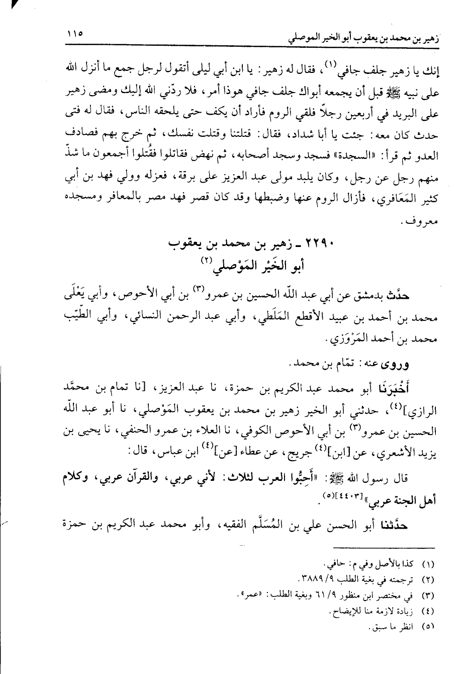 2290 - زهير بن محمد بن يعقوب أبو الخير الموصلي (2) حدث بدمشق عن أبي عبد الله الحسين بن عمرو (3) بن أبي الأحوص وأبي يعلى محمد بن أحمد بن عبيد الأقطع الملطي وأبي عبد الرحمن النسائي وأبي الطيب محمد بن أحمد المروزي وروى عنه تمام بن محمد أخبرنا أبو محمد عبد الكريم بن حمزة نا عبد العزيز نا تمام بن محمد الرازي (4) حدثني أبو الخير زهير بن محمد بن يعقوب الموصلي نا أبو عبد الله الحسين بن عمرو (3) بن أبي الأحوص الكوفي نا العلاء بن عمرو الحنفي نا يحيى بن يزيد الأشعري عن ابن (4) جريج عن عطاء عن ابن عباس قال قال رسول الله (صلى الله عليه وسلم) أحبوا العرب لثلاث لأني عربي والقرآن عربي وكلام أهل الجنة عربي