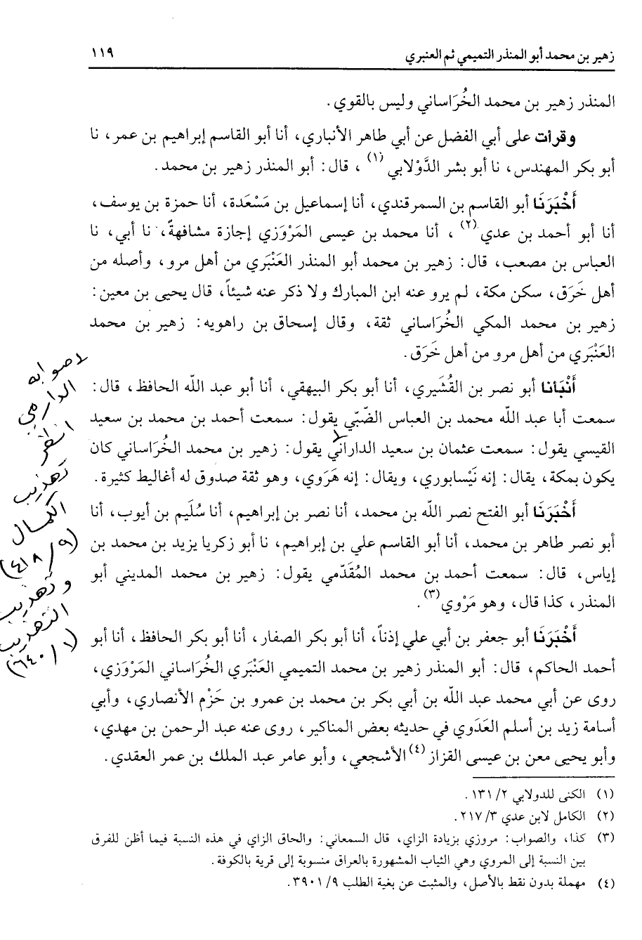 المنذر زهير بن محمد الخراساني وليس بالقوي وقرأت على أبي الفضل عن أبي طاهر الأنباري أنا أبو القاسم إبراهيم بن عمر نا أبو بكر المهندس نا أبو بشر الدولابي (1) قال أبو المنذر زهير بن محمد أخبرنا أبو القاسم بن السمرقندي أنا إسماعيل بن مسعدة أنا حمزة بن يوسف أنا أبو أحمد بن عدي (2) أنا محمد بن عيسى المروزي إجازة مشافهة نا أبي نا العباس بن مصعب قال زهير بن محمد أبو المنذر العنبري من أهل مرو وأصله من أهل خرق سكن مكة لم يرو عنه ابن المبارك ولا ذكر عنه شيئا قال يحيى بن معين زهير بن محمد المكي الخراساني ثقة وقال إسحاق بن راهويه زهير بن محمد العنبري من أهل مرو من أهل خرق أنبأنا أبو نصر بن القشيري أنا أبو بكر البيهقي أنا أبو عبد الله الحافظ قال سمعت أبا عبد الله محمد بن العباس الضبي يقول سمعت أحمد بن محمد بن سعيد القيسي يقول سمعت عثمان بن سعيد الداراني يقول زهير بن محمد الخراساني كان يكون بمكة يقال إنه نيسابوري ويقال إنه هروي وهو ثقة صدوق له أغاليط كثيرة أخبرنا أبو الفتح نصر الله بن محمد أنا نصر بن إبراهيم أنا سليم بن أيوب أنا أبو نصر طاهر بن محمد أنا أبو القاسم علي بن إبراهيم نا أبو زكريا يزيد بن محمد بن إياس قال سمعت أحمد بن محمد المقدمي يقول زهير بن محمد المديني أبو المنذر كذا قال وهو مروي (3) أخبرنا أبو جعفر بن أبي علي إذنا أنا أبو بكر الصفار أنا أبو بكر الحافظ أنا أبو أحمد الحاكم قال أبو المنذر زهير بن محمد التميمي العنبري الخراساني المروزي روى عن أبي محمد عبد الله بن أبي بكر بن محمد بن عمرو بن حزم الأنصاري وأبي أسامة زيد بن أسلم العدوي في حديثه بعض المناكير روى عنه عبد الرحمن بن مهدي وأبو يحيى معن بن عيسى القزاز (4) الأشجعي وأبو عامر عبد الملك بن عمر العقدي