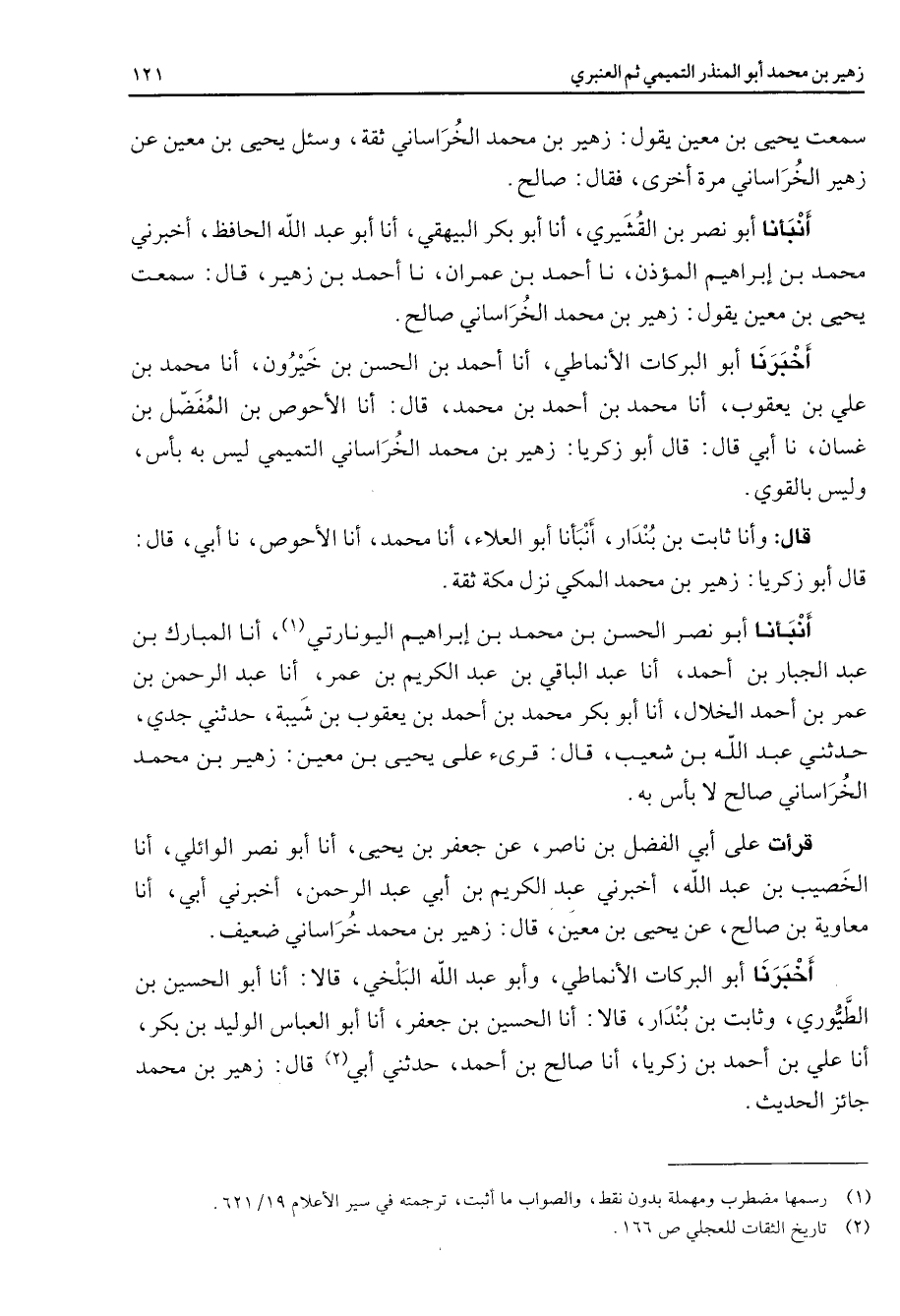 سمعت يحيى بن معين يقول زهير بن محمد الخراساني ثقة وسئل يحيى بن معين عن زهير الخراساني مرة أخرى فقال صالح أنبأنا أبو نصر بن القشيري أنا أبو بكر البيهقي أنا أبو عبد الله الحافظ أخبرني محمد بن إبراهيم المؤذن نا أحمد بن عمران نا أحمد بن زهير قال سمعت يحيى بن معين يقول زهير بن محمد الخراساني صالح أخبرنا أبو البركات الأنماطي أنا أحمد بن الحسن بن خيرون أنا محمد بن علي بن يعقوب أنا محمد بن أحمد بن محمد قال أنا الأحوص بن المفضل بن غسان نا أبي قال قال أبو زكريا زهير بن محمد الخراساني التميمي ليس به بأس وليس بالقوي قال وأنا ثابت بن بندار أنبأنا أبو العلاء أنا محمد أنا الأحوص نا أبي قال قال أبو زكريا زهير بن محمد المكي نزل مكة ثقة أنبأنا أبو نصر الحسن بن محمد بن إبراهيم اليونارتي (1) أنا المبارك بن عبد الجبار بن أحمد أنا عبد الباقي بن عبد الكريم بن عمر أنا عبد الرحمن بن عمر بن أحمد الخلال أنا أبو بكر محمد بن أحمد بن يعقوب بن شيبة حدثني جدي حدثني عبد الله بن شعيب قال قرئ على يحيى بن معين زهير بن محمد الخراساني صالح لا بأس به قرأت على أبي الفضل بن ناصر عن جعفر بن يحيى أنا أبو نصر الوائلي أنا الخصيب بن عبد الله أخبرني عبد الكريم بن أبي عبد الرحمن أخبرني أبي أنا معاوية بن صالح عن يحيى بن معين قال زهير بن محمد خراساني ضعيف أخبرنا أبو البركات الأنماطي وأبو عبد الله البلخي قالا أنا أبو الحسين بن الطيوري وثابت بن بندار قالا أنا الحسين بن جعفر أنا أبو العباس الوليد بن بكر أنا علي بن أحمد بن زكريا أنا صالح بن أحمد حدثني أبي (2) قال زهير بن محمد جائز الحديث