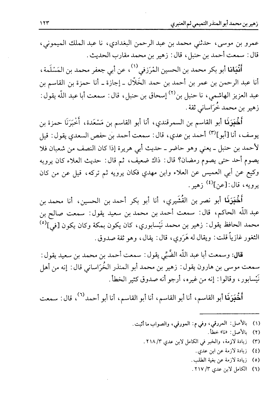 عمرو بن موسى حدثني محمد بن عبد الرحمن البغدادي نا عبد الملك الميموني قال سمعت أحمد بن حنبل قال زهير بن محمد مقارب الحديث أنبأنا أبو بكر محمد بن الحسين المرزفي (1) عن أبي جعفر محمد بن المسلمة أنا عبد الرحمن بن عمر بن احمد بن حمد الخلال إجازة أنا حمزة بن القاسم بن عبد العزيز الهاشمي نا حنبل بن (2) إسحاق بن حنبل قال سمعت أبا عبد الله يقول زهير بن محمد خراساني ثقة أخبرنا أبو القاسم بن السمرقندي أنا أبو القاسم بن مسعدة أخبرنا حمزة بن يوسف أنا أبو (3) أحمد بن عدي قال سمعت أحمد بن حفص السعدي يقول قيل لأحمد بن حنبل يعني وهو حاضر حديث أبي هريرة إذا كان النصف من شعبان فلا يصوم أحد حتى يصوم رمضان قال ذاك ضعيف ثم قال حديث العلاء كان يرويه وكيع عن أبي العميس عن العلاء وابن مهدي فكان يرويه ثم تركه قيل عن من كان يرويه قال عن (4) زهير أخبرنا أبو نصر بن القشيري أنا أبو بكر أحمد بن الحسين أنا محمد بن عبد الله الحاكم قال سمعت أحمد بن محمد بن سعيد يقول سمعت صالح بن محمد الحافظ يقول زهير بن محمد نيسابوري كان يكون بمكة وكان يكون في (5) الثغور غازيا قلت ويقال له هروي قال يقال وهو ثقة صدوق قال وسمعت أبا عبد الله الضبي يقول سمعت أحمد بن محمد بن سعيد يقول سمعت موسى بن هارون يقول زهير بن محمد أبو المنذر الخراساني قال إنه من أهل نيسابور وقالوا إنه من غيره أرجو أنه صدوق كثير الخطأ أخبرنا أبو القاسم أنا أبو القاسم أنا أبو القاسم أنا أبو أحمد (6) قال سمعت