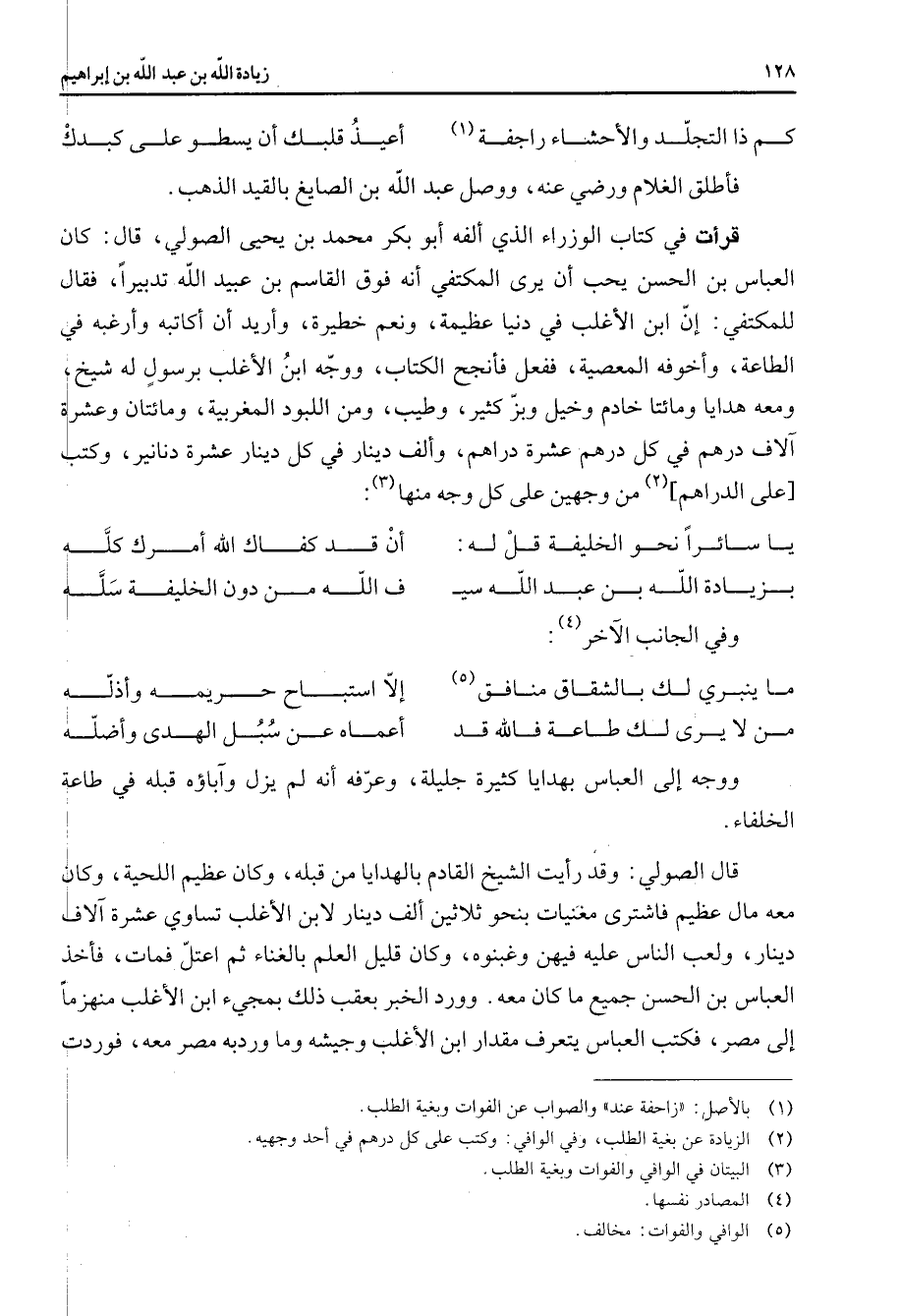 كم ذا التجلد والاحشاء راجفة (1) * أعيذ قلبك أن يسطو على كبدك * فأطلق الغلام ورضي عنه ووصل عبد الله بن الصايغ بالقيد الذهب قرأت في كتاب الوزراء الذي ألفه أبو بكر محمد بن يحيى الصولي قال كان العباس بن الحسن يحب أن يرى المكتفي أنه فوق القاسم بن عبيد الله تدبيرا فقال للمكتفي إن ابن الأغلب في دنيا عظيمة ونعم خطيرة وأريد أن أكاتبه وأرغبه في الطاعة وأخوفه المعصية ففعل فأنجح الكتاب ووجه ابن الأغلب برسول له شيخ ومعه هدايا ومائتا خادم وخيل وبز كثير وطيب ومن اللبود المغربية ومائتان وعشرة آلاف درهم في كل درهم عشرة دراهم وألف دينار في كل دينار عشرة دنانير وكتب على الدراهم (2) من وجهين على كل وجه منها (3) * يا سائرا نحو الخليفة قل له * أن قد كفاك الله أمرك كله بزيادة الله بن عبد الله سي * ف الله من دون الخليفة سله * وفي الجانب الآخر (4) * ما ينبري لك بالشقاق منافق (5) * إلا استباح حريمه وأذله من لا يرى لك طاعة فالله قد * أعماه عن سبل الهدى وأضله * ووجه إلى العباس بهدايا كثيرة جليلة وعرفه أنه لم يزل وآباؤه قبله في طاعة الخلفاء قال الصولي وقد رأيت الشيخ القادم بالهدايا من قبله وكان عظيم اللحية وكان معه مال عظيم فاشترى مغنيات بنحو ثلاثين ألف دينار لابن الأغلب تساوي عشرة آلاف دينار ولعب الناس عليه فيهن وغبنوه وكان قليل العلم بالغناء ثم اعتل فمات فأخذ العباس بن الحسن جميع ما كان معه وورد الخبر بعقب ذلك بمجئ ابن الأغلب منهزما إلى مصر فكتب العباس يتعرف مقدار ابن الأغلب وجيشه وما ورد به مصر معه فوردت