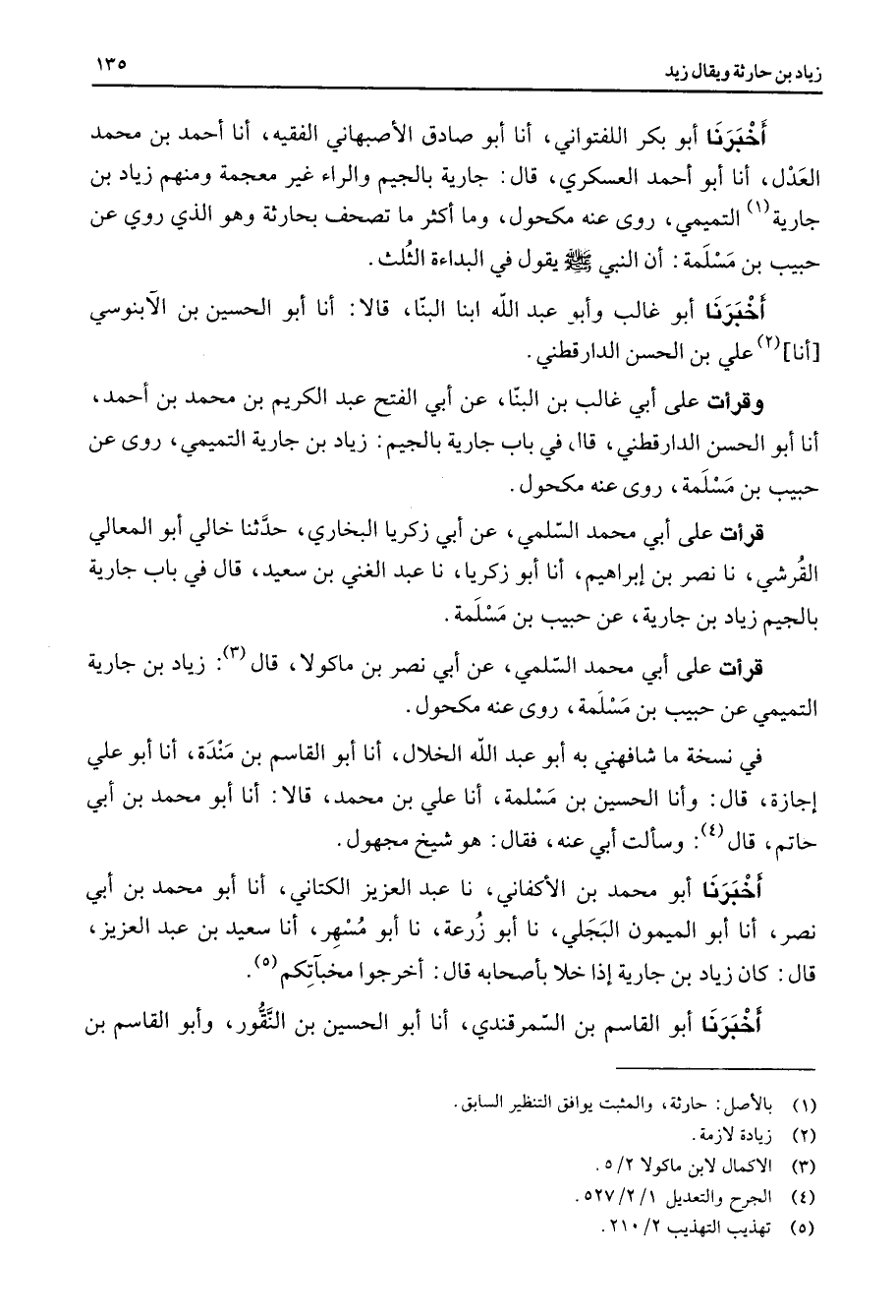 أخبرنا أبو بكر اللفتواني أنا أبو صادق الأصبهاني الفقيه أنا أحمد بن محمد العدل أنا أبو أحمد العسكري قال جارية بالجيم والراء غير معجمة ومنهم زياد بن جارية (1) التميمي روى عنه مكحول وما أكثر ما تصحف بحارثة وهو الذي روي عن حبيب بن مسلمة أن النبي (صلى الله عليه وسلم) يقول في البداءة الثلث أخبرنا أبو غالب وأبو عبد الله ابنا البنا قالا أنا أبو الحسين بن الآبنوسي أنا (2) علي بن الحسن الدارقطني وقرأت على أبي غالب بن البنا عن أبي الفتح عبد الكريم بن محمد بن أحمد أنا أبو الحسن الدارقطني قال في باب جارية بالجيم زياد بن جارية التميمي روى عن حبيب بن مسلمة روى عنه مكحول قرأت على أبي محمد السلمي عن أبي زكريا البخاري حدثنا خالي أبو المعالي القرشي نا نصر بن إبراهيم أنا أبو زكريا نا عبد الغني بن سعيد قال في باب جارية بالجيم زياد بن جارية عن حبيب بن مسلمة قرأت على أبي محمد السلمي عن أبي نصر بن ماكولا قال (3) زياد بن جارية التميمي عن حبيب بن مسلمة روى عنه مكحول في نسخة ما شافهني به أبو عبد الله الخلال أنا أبو القاسم بن مندة أنا أبو علي إجازة قال وأنا الحسين بن مسلمة أنا علي بن محمد قالا أنا أبو محمد بن أبي حاتم قال (4) وسألت أبي عنه فقال هو شيخ مجهول أخبرنا أبو محمد بن الأكفاني نا عبد العزيز الكتاني أنا أبو محمد بن أبي نصر أنا أبو الميمون البجلي نا أبو زرعة نا أبو مسهر أنا سعيد بن عبد العزيز قال كان زياد بن جارية إذا خلا بأصحابه قال أخرجوا مخبآتكم (5) أخبرنا أبو القاسم بن السمرقندي أنا أبو الحسين بن النقور وأبو القاسم بن