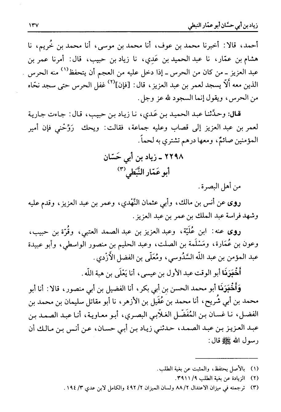 2298 - زياد بن أبي حسان أبو عمار النبطي (3) من أهل البصرة روى عن أنس بن مالك وأبي عثمان النهدي وعمر بن عبد العزيز وقدم عليه وشهد فراسة عبد الملك بن عمر بن عبد العزيز روى عنه ابن علية وعبد العزيز بن عبد الصمد العتبي وقرة بن حبيب وعون بن عمارة ومسلمة بن الصلت وعبد الحليم بن منصور الواسطي وأبو عبيدة عبد المؤمن بن عبد الله السدوسي ومعلى بن الفضل الأزدي أخبرنا أبو الوقت عبد الأول بن عيسى أنا يعلى بن هبة الله وأخبرنا أبو محمد الحسن بن أبي بكر أنا الفضيل بن أبي منصور قالا أنا أبو محمد بن أبي شريح أنا محمد بن عقيل بن الأزهر نا أبو مقاتل سليمان بن محمد بن الفضل نا غسان بن المفضل الغلابي البصري أبو معاوية أنا عبد الصمد بن عبد العزيز بن عبد الصمد حدثني زياد بن أبي حسان عن أنس بن مالك أن رسول الله (صلى الله عليه وسلم) قال