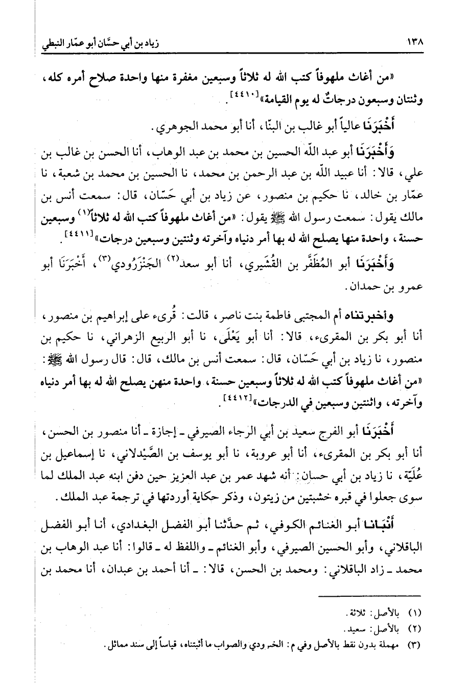 [4410] أخبرنا عاليا أبو غالب بن البنا أنا أبو محمد الجوهري وأخبرنا أبو عبد الله الحسين بن محمد بن عبد الوهاب أنا الحسن بن غالب بن علي قالا أنا عبيد الله بن عبد الرحمن بن محمد نا الحسين بن محمد بن شعبة نا عمار بن خالد نا حكيم بن منصور عن زياد بن أبي حسان قال سمعت أنس بن مالك يقول سمعت رسول الله (صلى الله عليه وسلم) يقول من أغاث ملهوفا كتب الله له ثلاثا (1) وسبعين حسنة واحدة منها يصلح الله له بها أمر دنياه وآخرته وثنتين وسبعين درجات