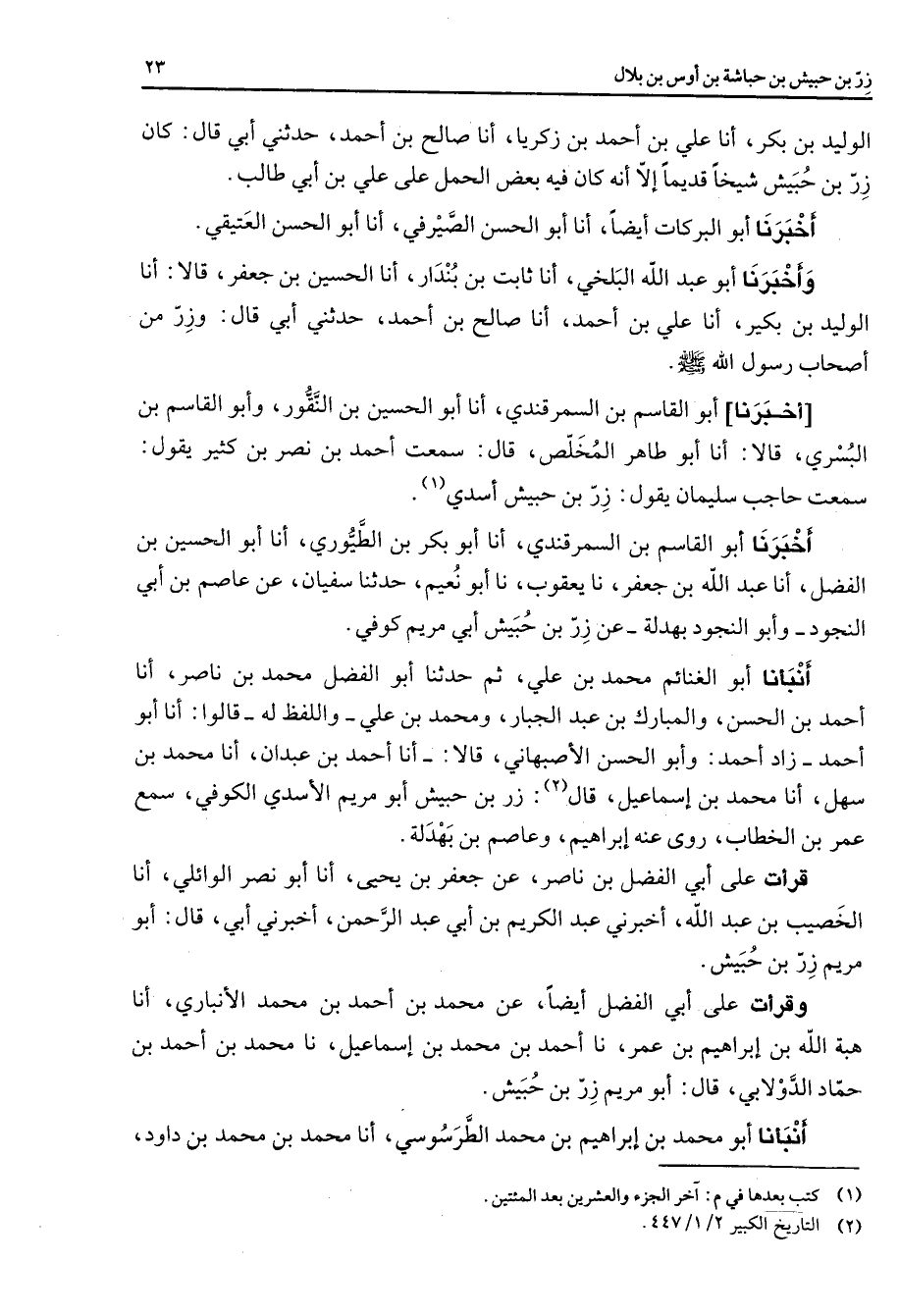 الوليد بن بكر أنا علي بن أحمد بن زكريا أنا صالح بن أحمد حدثني أبي قال كان زر بن حبيش شيخا قديما إلا أنه كان فيه بعض الحمل على علي بن أبي طالب أخبرنا أبو البركات أيضا أنا أبو الحسن الصيرفي أنا أبو الحسين العتيقي وأخبرنا أبو عبد الله البلخي أنا ثابت بن بندار أنا الحسين بن جعفر قالا أنا الوليد بن بكير أنا علي بن أحمد أنا صالح بن أحمد حدثني أبي قال وزر من أصحاب رسول الله (صلى الله عليه وسلم) أخبرنا أبو القاسم بن السمرقندي أنا أبو الحسين بن النقور وأبو القاسم بن البسري قالا أنا أبو طاهر المخلص قال سمعت أحمد بن نصر بن كثير يقول سمعت حاجب سليمان يقول زر بن حبيش أسدي (1) أخبرنا أبو القاسم بن السمرقندي أنا أبو بكر بن الطيوري أنا أبو الحسين بن الفضل أنا عبد الله بن جعفر نا يعقوب نا أبو نعيم حدثنا سفيان عن عاصم بن أبي النجود وأبو النجود بهدلة عن زر بن حبيش أبي مريم كوفي أنبأنا أبو الغنائم محمد بن علي ثم حدثنا أبو الفضل محمد بن ناصر أنا أحمد بن الحسن والمبارك بن عبد الجبار ومحمد بن علي واللفظ له قالوا أنا أبو أحمد زاد أحمد وأبو الحسن الأصبهاني قالا أنا أحمد بن عبدان أنا محمد بن سهل أنا محمد بن إسماعيل قال (2) زر بن حبيش أبو مريم الأسدي الكوفي سمع عمر بن الخطابروى عنه إبراهيم وعاصم بن بهدلة قرأت على أبي الفضل بن ناصر عن جعفر بن يحيى أنا أبو نصر الوائلي أنا الخصيب بن عبد الله أخبرني عبد الكريم بن أبي عبد الرحمن أخبرني أبي قال أبو مريم زر بن حبيش وقرأت على أبي الفضل أيضا عن محمد بن أحمد بن محمد الأنباري أنا هبة الله بن إبراهيم بن عمر نا أحمد بن محمد بن إسماعيل نا محمد بن أحمد بن حماد الدولابي قال أبو مريم زر بن حبيش أنبأنا أبو محمد بن إبراهيم بن محمد الطرسوسي أنا محمد بن محمد بن داود