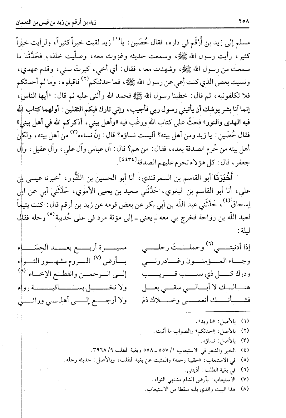 مسلم إلى زيد بن أرقم في داره فقال حصين يا (1) زيد لقيت خيرا كثيرا ولرأيت خيرا كثير رأيت رسول الله (صلى الله عليه وسلم) وسمعت حديثه وغزوت معه وصليت خلفه فحدثنا ما سمعت من رسول الله (صلى الله عليه وسلم) وشهدت معه فقال أي أخي كبرت سني وقدم عهدي ونسيت بعض الذي كنت أعي عن رسول الله (صلى الله عليه وسلم) فما حدثتكم (2) فاقبلوه وما لم أحدثكم فلا تكلفونيه ثم قال خطبنا رسول الله (صلى الله عليه وسلم) فحمد الله وأثنى عليه ثم قال أيها الناس إنما أنا بشر يوشك أن يأتيني رسول ربي فأجيب وإني تارك فيكم الثقلين أولهما كتاب الله فيه الهدى والنور فحث على كتاب الله ورغب فيه وأهل بيتي أذكركم الله في أهل بيتي فقال حصين يا زيد ومن أهل بيته أليست نساؤه قال إن نساءه (3) من أهل بيته ولكن أهل بيته من حرم الصدقة بعده فقال من هم قال آل عباس وآل علي وآل عقيل وآل جعفر قال كل هؤلاء تحرم عليهم الصدقة