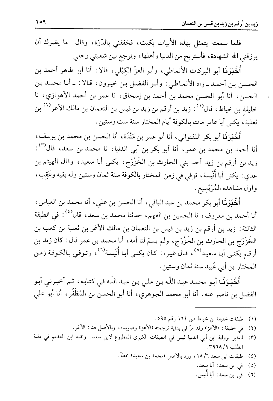 فلما سمعته يتمثل بهذه الأبيات بكيت فخفقني بالدرة وقال ما يضرك أن يرزقني الله الشهادة فأستريح من الدنيا وأهلها وترجع بين شعبتي رحلي أخبرنا أبو البركات الأنماطي وأبو العز الكيلي قالا أنا أبو طاهر أحمد بن الحسن بن أحمد زاد الأنماطي وأبو الفضل بن خيرون قالا أنا محمد بن الحسن أنا أبو الحسن محمد بن أحمد بن إسحاق نا عمر بن أحمد الأهوازي نا خليفة بن خياط قال (1) زيد بن أرقم بن زيد بن قيس بن النعمان بن مالك الأغر (2) بن ثعلبة يكنى أبا عامر مات بالكوفة أيام المختار سنة ست وستين أخبرنا أبو بكر اللفتواني أنا أبو عمر بن مندة أنا الحسن بن محمد بن يوسف أنا أحمد بن محمد بن عمر أنا أبو بكر بن أبي الدنيا نا محمد بن سعد قال (3) زيد بن أرقم بن زيد أحد بني الحارث بن الخزرج يكنى أبا سعيد وقال الهيثم بن عدي يكنى أبا أنيسة توفي في زمن المختار بالكوفة سنة ثمان وستين وله بقية وعقب وأول مشاهده المريسيع أخبرنا أبو بكر محمد بن عبد الباقي أنا الحسن بن علي أنا محمد بن العباس أنا أحمد بن معروف نا الحسين بن الفهم حدثنا محمد بن سعد قال (4) في الطبقة الثالثة زيد بن أرقم بن زيد بن قيس بن النعمان بن مالك الأغر بن ثعلبة بن كعب بن الخزرج بن الحارث بن الخزرج ولم يسم لنا أمه أنا محمد بن عمر قال كان زيد بن أرقم يكنى أبا سعيد (5) قال غيره كان يكنى أبا أنيسة (6) وتوفي بالكوفة زمن المختار بن أبي عبيد سنة ثمان وستين أخبرنا أبو محمد عبد الله بن علي بن عبد الله في كتابه ثم أخبرني أبو الفضل بن ناصر عنه أنا أبو محمد الجوهري أنا أبو الحسن بن المظفر أنا أبو علي