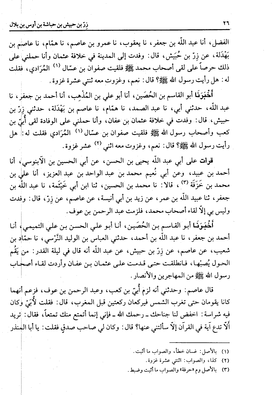محمد بن خزفة (3) قالا نا محمد بن الحسين ثنا ابن أبي خيثمة نا عبد الله بن جعفر ثنا عبيد الله بن عمر عن زيد بن أبي أنيسة عن عاصم عن زر قال وفدت وليس بي إلا لقاء أصحاب محمد فلزمت عبد الرحمن بن عوف أخبرنا أبو القاسم بن الحصين أنا أبو علي الحسن بن علي التميمي أنا أحمد بن جعفر نا عبد الله بن أحمد حدثني العباس بن الوليد النرسي نا حماد بن شعيب عن عاصم عن زر بن حبيش عن عبد الله أنه قال في ليلة القدر من يقم الحول يصبها فانطلقت حتى قدمت على عثمان بن عفان وأردت لقاء أصحاب رسول الله (صلى الله عليه وسلم) من المهاجرين والأنصار قال عاصم وحدثني أنه لزم أبي بن كعب وعبد الرحمن بن عوف فزعم أنهما كانا يقومان حتى تغرب الشمس فيركعان ركعتين قبل المغرب قال فقلت لأبي وكان فيه شراسة اخفض لنا جناحك رحمك الله فإني إنما أتمتع منك تمتعا فقال تريد ألا تدع آية في القرآن إلا سألتني عنها قال وكان لي صاحب صدق فقلت يا أبا المنذر