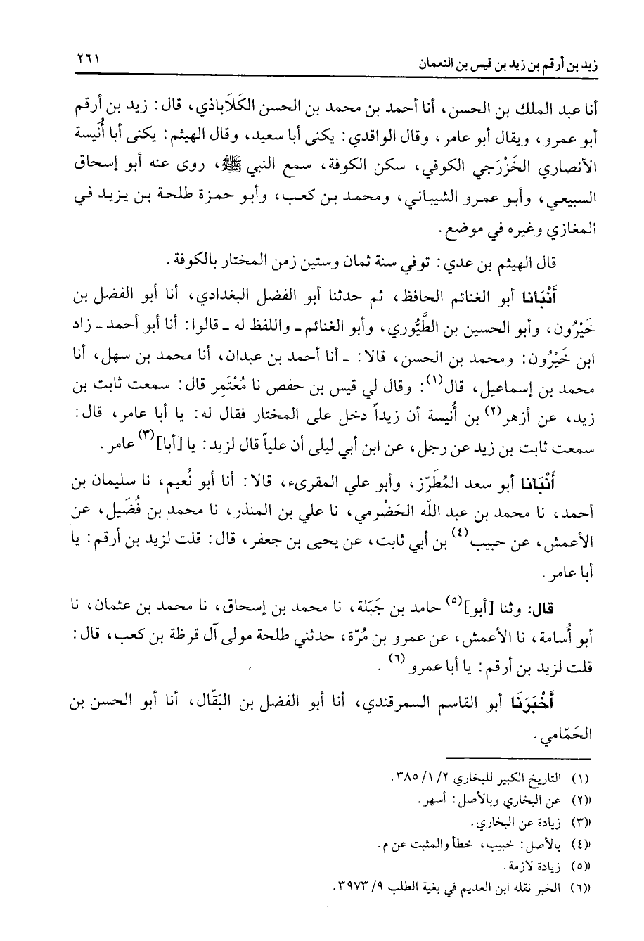 أنا عبد الملك بن الحسن أنا أحمد بن محمد بن الحسن الكلاباذي قال زيد بن أرقم أبو عمرو ويقال أبو عامر وقال الواقدي يكنى أبا سعيد وقال الهيثم يكنى أبا أنيسة الأنصاري الخزرجي الكوفي سكن الكوفة سمع النبي (صلى الله عليه وسلم) روى عنه أبو إسحاق السبيعي وأبو عمرو الشيباني ومحمد بن كعب وأبو حمزة طلحة بن يزيد في المغازي وغيره في موضع قال الهيثم بن عدي توفي سنة ثمان وستين زمن المختار بالكوفة أنبأنا أبو الغنائم الحافظ ثم حدثنا أبو الفضل البغدادي أنا أبو الفضل بن خيرون وأبو الحسين بن الطيوري وأبو الغنائم واللفظ له قالوا أنا أبو أحمد زاد ابن خيرون ومحمد بن الحسن قالا أنا أحمد بن عبدان أنا محمد بن سهل أنا محمد بن إسماعيل قال (1) وقال لي قيس بن حفص نا معتمر قال سمعت ثابت بن زيد عن أزهر (2) بن أنيسة أن زيدا دخل على المختار فقال له يا أبا عامر قال سمعت ثابت بن زيد عن رجل عن ابن أبي ليلى أن عليا قال لزيد يا أبا (3) عامر أنبأنا أبو سعد المطرز وأبو علي المقرئ قالا أنا أبو نعيم نا سليمان بن أحمد نا محمد بن عبد الله الحضرمي نا علي بن المنذر نا محمد بن فضيل عن الأعمش عن حبيب (4) بن أبي ثابت عن يحيى بن جعفر قال قلت لزيد بن أرقم يا أبا عامر قال وثنا أبو (5) حامد بن جبلة نا محمد بن إسحاق نا محمد بن عثمان نا أبو أسامة نا الأعمش عن عمرو بن مرة حدثني طلحة مولى آل قرظة بن كعب قال قلت لزيد بن أرقم يا أبا عمرو (6) أخبرنا أبو القاسم السمرقندي أنا أبو الفضل بن البقال أنا أبو الحسن بن الحمامي