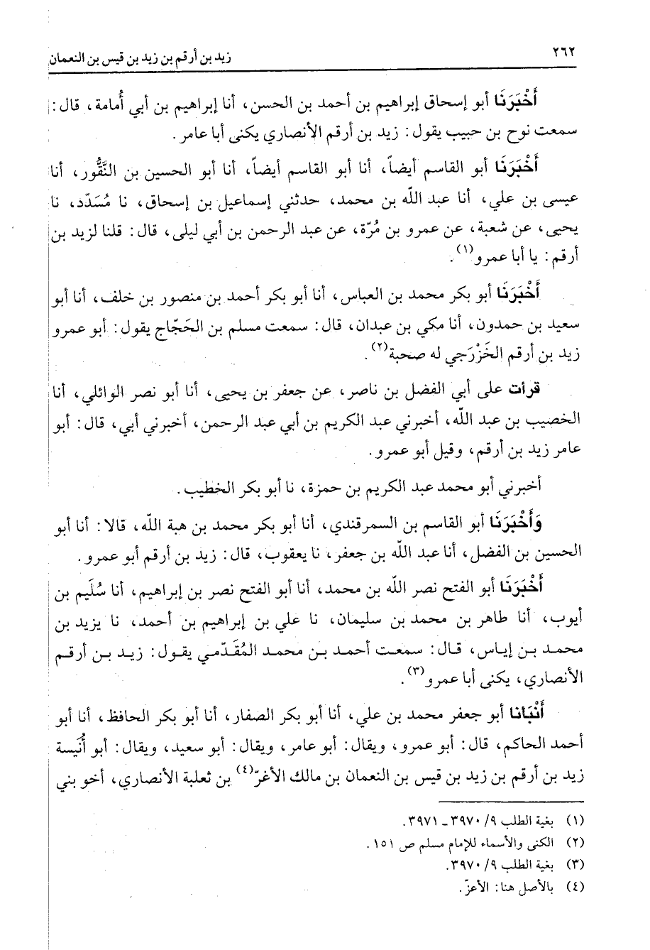 أخبرنا أبو إسحاق إبراهيم بن أحمد بن الحسن أنا إبراهيم بن أبي أمامة قال سمعت نوح بن حبيب يقول زيد بن أرقم الأنصاري يكنى أبا عامر أخبرنا أبو القاسم أيضا أنا أبو القاسم أيضا أنا أبو الحسين بن النقور أنا عيسى بن علي أنا عبد الله بن محمد حدثني إسماعيل بن إسحاق نا مسدد نا يحيى عن شعبة عن عمرو بن مرة عن عبد الرحمن بن أبي ليلى قال قلنا لزيد بن أرقم يا أبا عمرو (1) أخبرنا أبو بكر محمد بن العباس أنا أبو بكر أحمد بن منصور بن خلف أنا أبو سعيد بن حمدون أنا مكي بن عبدان قال سمعت مسلم بن الحجاج يقول أبو عمرو زيد بن أرقم الخزرجي له صحبة (2) قرأت على أبي الفضل بن ناصر عن جعفر بن يحيى أنا أبو نصر الوائلي أنا الخصيب بن عبد الله أخبرني عبد الكريم بن أبي عبد الرحمن أخبرني أبي قال أبو عامر زيد بن أرقم وقيل أبو عمرو أخبرني أبو محمد عبد الكريم بن حمزة نا أبو بكر الخطيب وأخبرنا أبو القاسم بن السمرقندي أنا أبو بكر محمد بن هبة الله قالا أنا أبو الحسين بن الفضل أنا عبد الله بن جعفر نا يعقوب قال زيد بن أرقم أبو عمرو أخبرنا أبو الفتح نصر الله بن محمد أنا أبو الفتح نصر بن إبراهيم أنا سليم بن أيوب أنا طاهر بن محمد بن سليمان نا علي بن إبراهيم بن أحمد نا يزيد بن محمد بن إياس قال سمعت أحمد بن محمد المقدمي يقول زيد بن أرقم الأنصاري يكنى أبا عمرو (3) أنبأنا أبو جعفر محمد بن علي أنا أبو بكر الصفار أنا أبو بكر الحافظ أنا أبو أحمد الحاكم قال أبو عمرو ويقال أبو عامر ويقال أبو سعيد ويقال أبو أنيسة زيد بن أرقم بن زيد بن قيس بن النعمان بن مالك الأغر (4) بن ثعلبة الأنصاري أخو بني