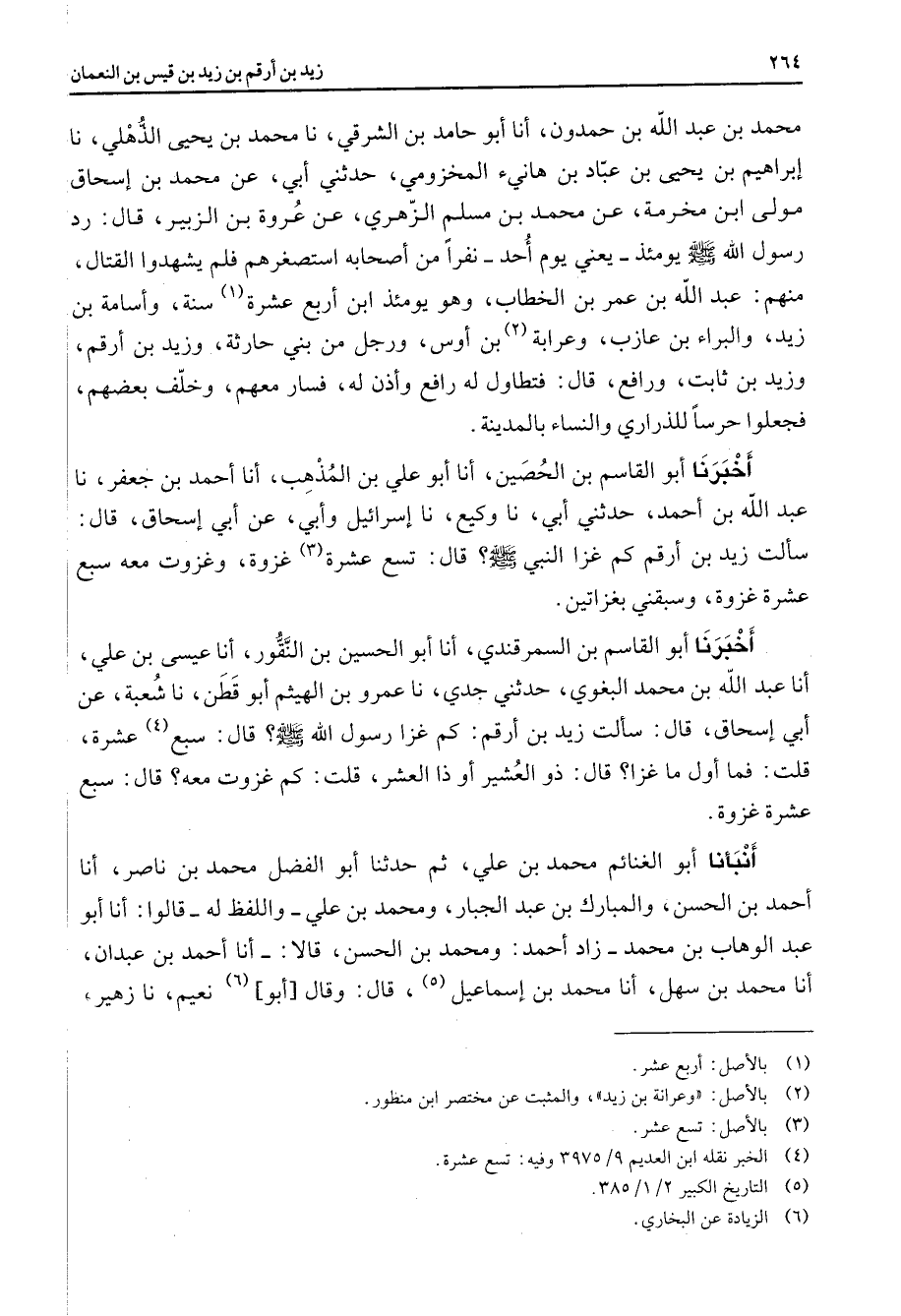 محمد بن عبد الله بن حمدون أنا أبو حامد بن الشرقي نا محمد بن يحيى الذهلي نا إبراهيم بن يحيى بن عباد بن هانئ المخزومي حدثني أبي عن محمد بن إسحاق مولى ابن مخرمة عن محمد بن مسلم الزهري عن عروة بن الزبير قال رد رسول الله (صلى الله عليه وسلم) يومئذ يعني يوم أحد نفرا من أصحابه استصغرهم فلم يشهدوا القتال منهم عبد الله بن عمر بن الخطاب وهو يومئذ ابن أربع عشرة (1) سنة وأسامة بن زيد والبراء بن عازب وعرابة (2) بن أوس ورجل من بني حارثة وزيد بن أرقم وزيد بن ثابت ورافع قال فتطاول له رافع وأذن له فسار معهم وخلف بعضهم فجعلوا حرسا للذراري والنساء بالمدينة أخبرنا أبو القاسم بن الحصين أنا أبو علي بن المذهب أنا أحمد بن جعفر نا عبد الله بن أحمد حدثني أبي نا وكيع نا إسرائيل وأبي عن أبي إسحاق قال سألت زيد بن أرقم كم غزا النبي (صلى الله عليه وسلم) قال تسع عشرة (3) غزوة وغزوت معه سبع عشرة غزوة وسبقني بغزاتين أخبرنا أبو القاسم بن السمرقندي أنا أبو الحسين بن النقور أنا عيسى بن علي أنا عبد الله بن محمد البغوي حدثني جدي نا عمرو بن الهيثم أبو قطن نا شعبة عن أبي إسحاق قال سألت زيد بن أرقم كم غزا رسول الله (صلى الله عليه وسلم) قال سبع (4) عشرة قلت فما أول ما غزا قال ذو العشير أو ذا العشر قلت كم غزوت معه قال سبع عشرة غزوة أنبأنا أبو الغنائم محمد بن علي ثم حدثنا أبو الفضل محمد بن ناصر أنا أحمد بن الحسن والمبارك بن عبد الجبار ومحمد بن علي واللفظ له قالوا أنا أبو عبد الوهاب بن محمد زاد أحمد ومحمد بن الحسن قالا أنا أحمد بن عبدان أنا محمد بن سهل أنا محمد بن إسماعيل (5) قال وقال أبو (6) نعيم نا زهير