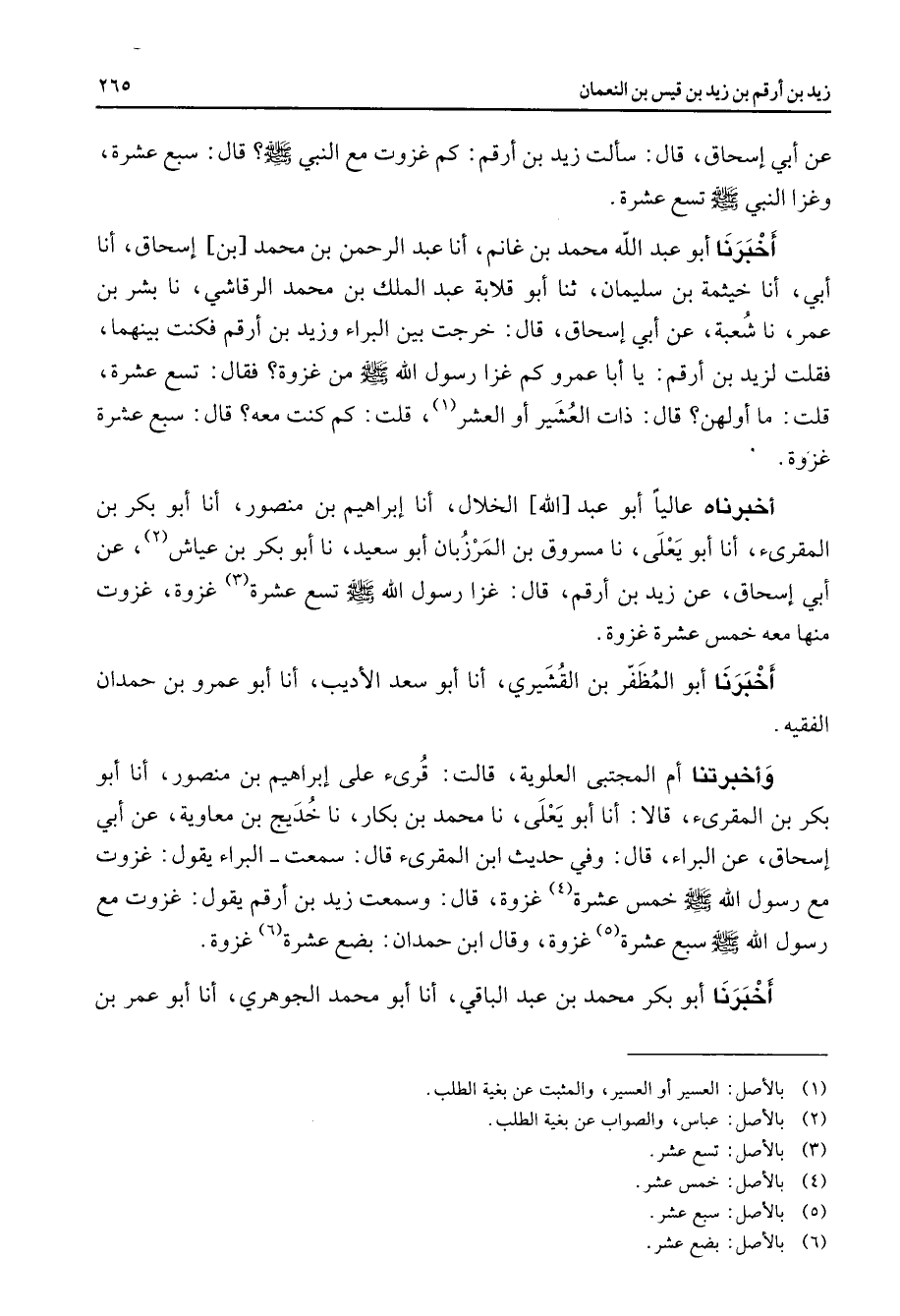 عن أبي إسحاق قال سألت زيد بن أرقم كم غزوت مع النبي (صلى الله عليه وسلم) قال سبع عشرة وغزا النبي (صلى الله عليه وسلم) تسع عشرة أخبرنا أبو عبد الله محمد بن غانم أنا عبد الرحمن بن محمد بن إسحاق أنا أبي أنا خيثمة بن سليمان ثنا أبو قلابة عبد الملك بن محمد الرقاشي نا بشر بن عمر نا شعبة عن أبي إسحاق قال خرجت بين البراء وزيد بن أرقم فكنت بينهما فقلت لزيد بن أرقم يا أبا عمرو كم غزا رسول الله (صلى الله عليه وسلم) من غزوة فقال تسع عشرة قلت ما أولهن قال ذات العشير أو العشر قلت كم كنت معه قال سبع عشرة غزوة أخبرناه عاليا أبو عبد الله الخلال أنا إبراهيم بن منصور أنا أبو بكر بن المقرئ أنا أبو يعلى نا مسروق بن المرزبان أبو سعيد نا أبو بكر بن عياش (2) عن أبي إسحاق عن زيد بن أرقم قال غزا رسول الله تسع عشرة (3) غزوة غزوت منها معه خمس عشرة غزوة أخبرنا أبو المظفر بن القشيري أنا أبو سعد الأديب أنا أبو عمرو بن حمدان الفقيه وأخبرتنا أم المجتبى العلوية قالت قرئ على إبراهيم بن منصور أنا أبو بكر بن المقرئ قالا أنا أبو يعلى نا محمد بن بكار نا خديج بن معاوية عن أبي إسحاق عن البراء قال وفي حديث ابن المقرئ قال سمعت البراء يقول غزوت مع رسول الله (صلى الله عليه وسلم) خمس عشرة (5) غزوة قال وسمعت زيد بن أرقم يقول غزوت مع رسول الله (صلى الله عليه وسلم) سبع عشرة (5) غزوة وقال ابن حمدان بضع عشرة (6) غزوة أخبرنا أبو بكر محمد بن عبد الباقي أنا أبو محمد الجوهري أنا أبو عمر بن