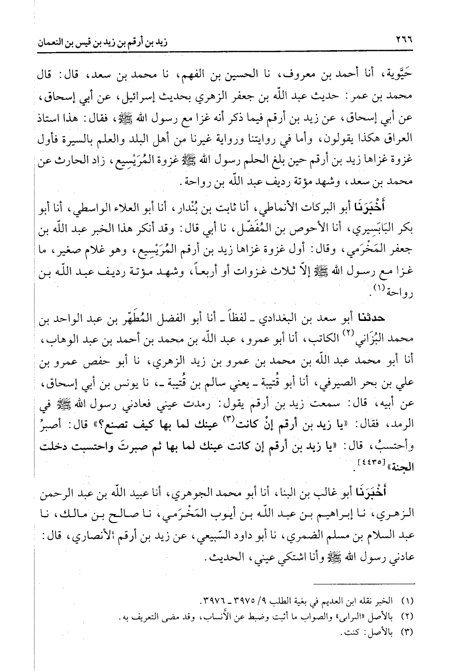 حيوية أنا أحمد بن معروف نا الحسين بن الفهم نا محمد بن سعد قال قال محمد بن عمر حديث عبد الله بن جعفر الزهري بحديث إسرائيل عن أبي إسحاق عن أبي إسحاق عن زيد بن أرقم فيما ذكر أنه غزا مع رسول الله (صلى الله عليه وسلم) فقال هذا استاذ العراق هكذا يقولون وأما في روايتنا ورواية غيرنا من أهل البلد والعلم بالسيرة فأول غزوة غزاها زيد بن أرقم حين بلغ الحلم رسول الله (صلى الله عليه وسلم) غزوة المريسيع زاد الحارث عن محمد بن سعد وشهد مؤتة رديف عبد الله بن رواحة أخبرنا أبو البركات الأنماطي أنا ثابت بن بندار أنا أبو العلاء الواسطي أنا أبو بكر البابسيري أنا الأحوص بن المفضل نا أبي قال وقد أنكر هذا الخبر عبد الله بن جعفر المخرمي وقال أول غزوة غزاها زيد بن أرقم المريسيع وهو غلام صغير ما غزا مع رسول الله (صلى الله عليه وسلم) إلا ثلاث غزوات أو أربعا وشهد مؤتة رديف عبد الله بن رواحة (1) حدثنا أبو سعد بن البغدادي لفظا أنا أبو الفضل المطهر بن عبد الواحد بن محمد البزاني (2) الكاتب أنا أبو عمرو عبد الله بن محمد بن أحمد بن عبد الوهاب أنا أبو محمد عبد الله بن محمد بن عمرو بن زيد الزهري نا أبو حفص عمرو بن علي بن بحر الصيرفي أنا أبو قتيبة يعني سالم بن قتيبة نا يونس بن أبي إسحاق عن أبيه قال سمعت زيد بن أرقم يقول رمدت عيني فعادني رسول الله (صلى الله عليه وسلم) في الرمد فقال يا زيد بن أرقم إن كانت (3) عينك لما بها كيف تصنع قال أصبر وأحتسب قال يا زيد بن أرقم إن كانت عينك لما بها ثم صبرت واحتسبت دخلت الجنة