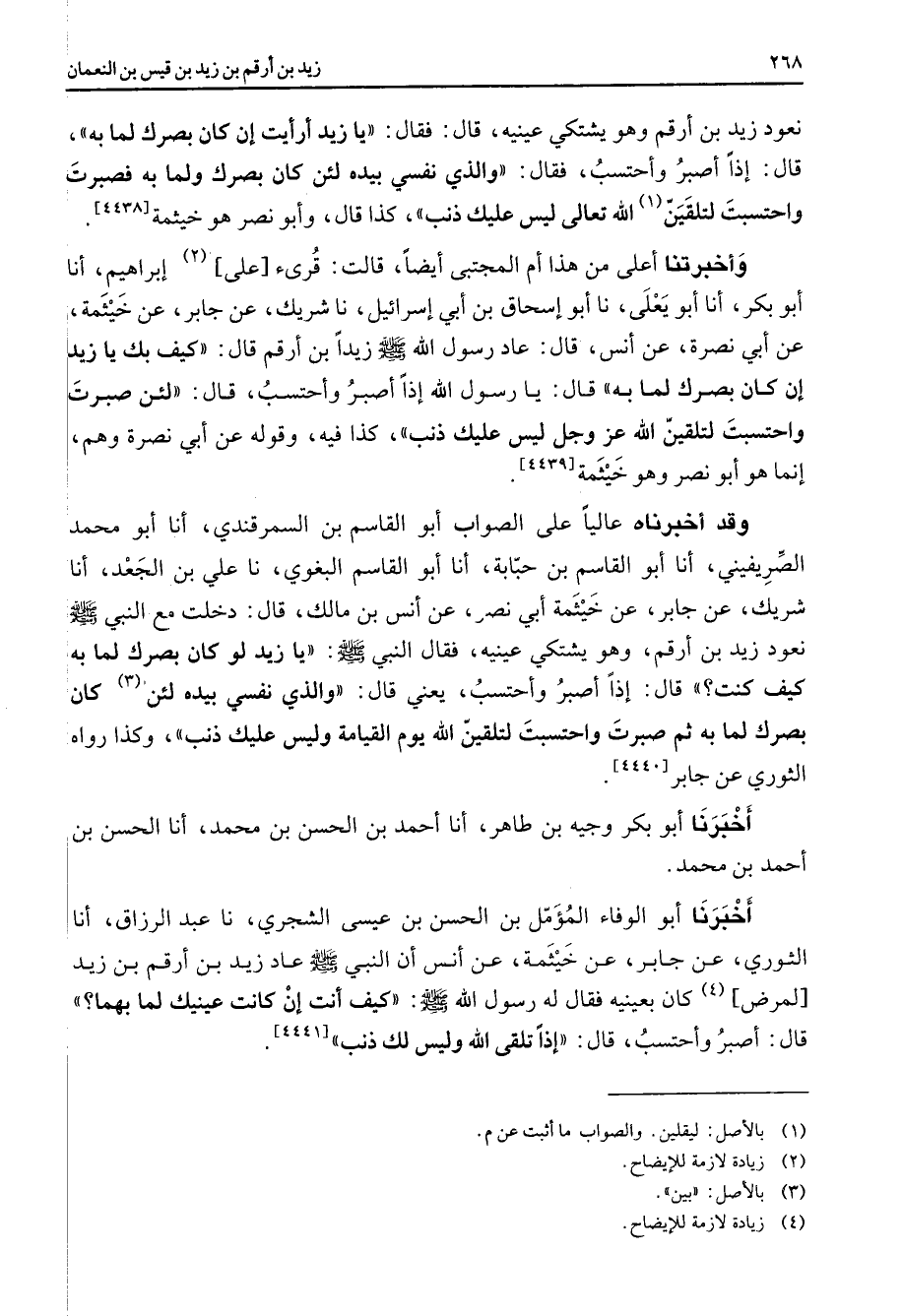 [4439] وقد أخبرناه عاليا على الصواب أبو القاسم بن السمرقندي أنا أبو محمد الصريفيني أنا أبو القاسم بن حبابة أنا أبو القاسم البغوي نا علي بن الجعد أنا شريك عن جابر عن خيثمة أبي نصر عن أنس بن مالك قال دخلت مع النبي (صلى الله عليه وسلم) نعود زيد بن أرقم وهو يشتكي عينيه فقال النبي (صلى الله عليه وسلم) يا زيد لو كان بصرك لما به كيف كنت قال إذا أصبر وأحتسب يعني قال والذي نفسي بيده لئن (3) كان بصرك لما به ثم صبرت واحتسبت لتلقين الله يوم القيامة وليس عليك ذنب وكذا رواه الثوري عن جابر